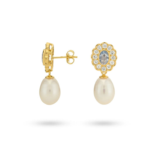 Sterling Silver Yellow Gold Plated Freshwater Pearl & CZ Drop Earrings