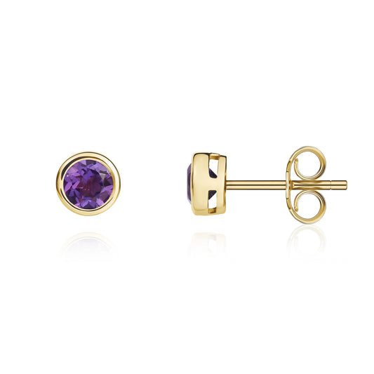 9ct Yellow Gold Round Amethyst Rubover Stud Earrings