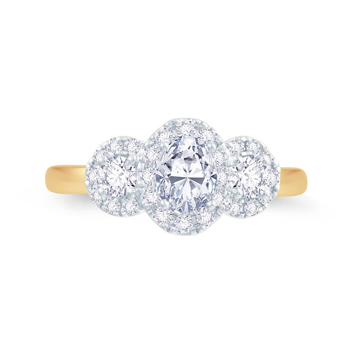 18ct Yellow Gold Oval & Halo Three Stone Diamond Ring, 0.83ct