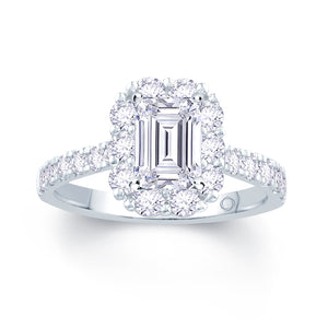Platinum Emerald & Halo, Split Shoulder Set Diamonds, 0.88ct
