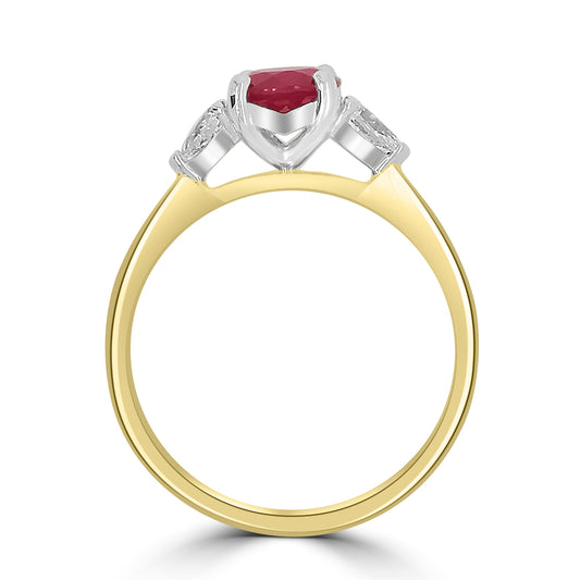 18ct Yellow Gold Round & Pear Ruby, Diamond Three Stone Ring
