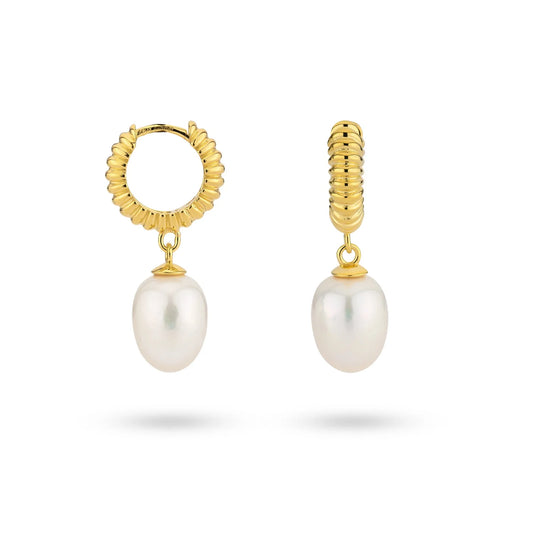 Sterling Silver Yellow Gold Plated Pearl Drop Ribbed Hoop Earrings