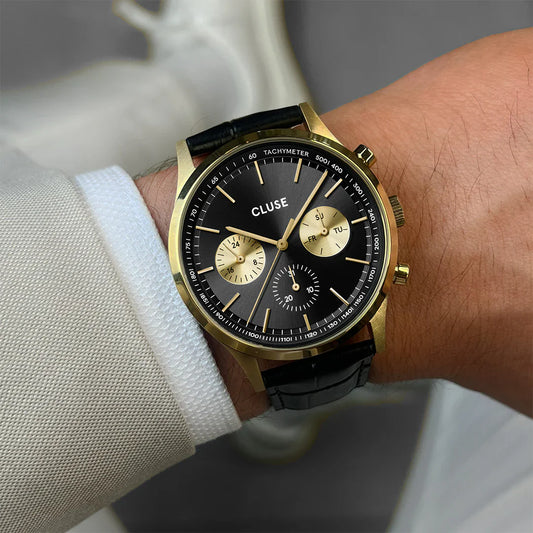 Cluse 42mm Anthéor Black & Gold 3 Dial Leather Strap Watch