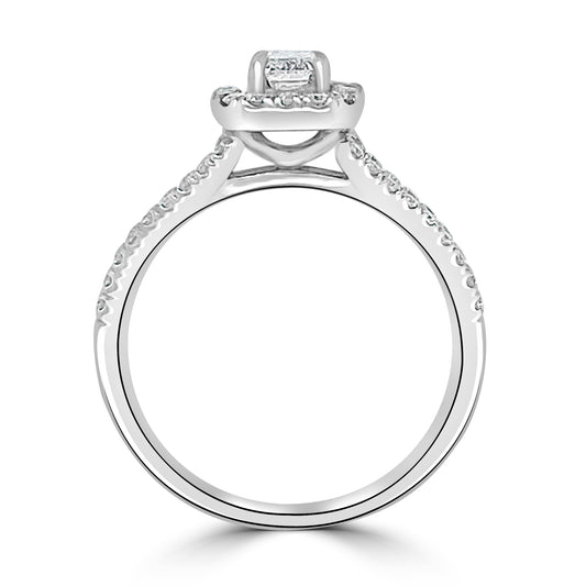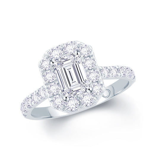 Platinum Emerald & Halo, Split Shoulder Set Diamonds, 0.88ct