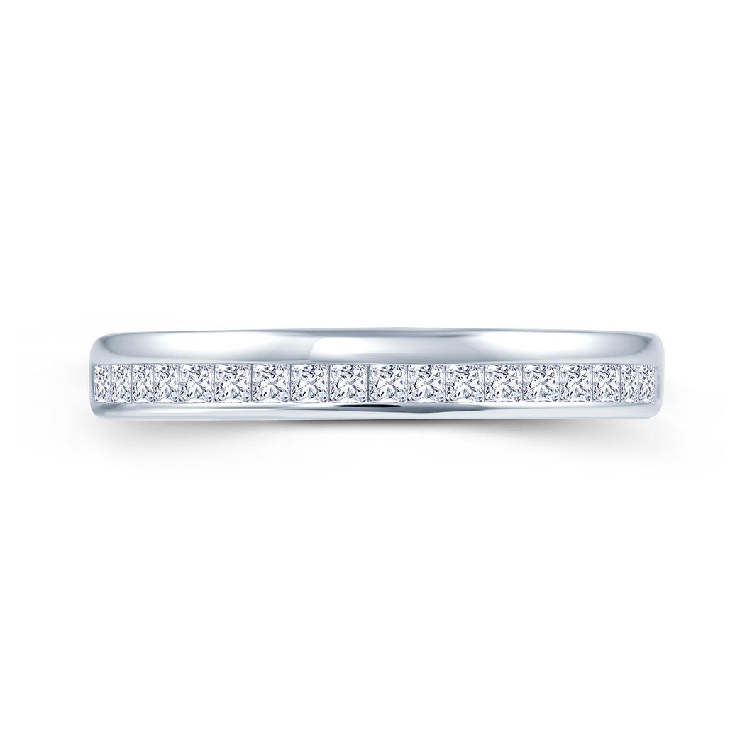This exquisite diamond wedding band presents a offset channel setting, meaning the princess cut diamonds sweep down one side so they are not covered by the diamond/s of the engagement ring, holding 0.45ct of princess cut diamonds in a 3.5mm wide hallmarked 750 white gold band.