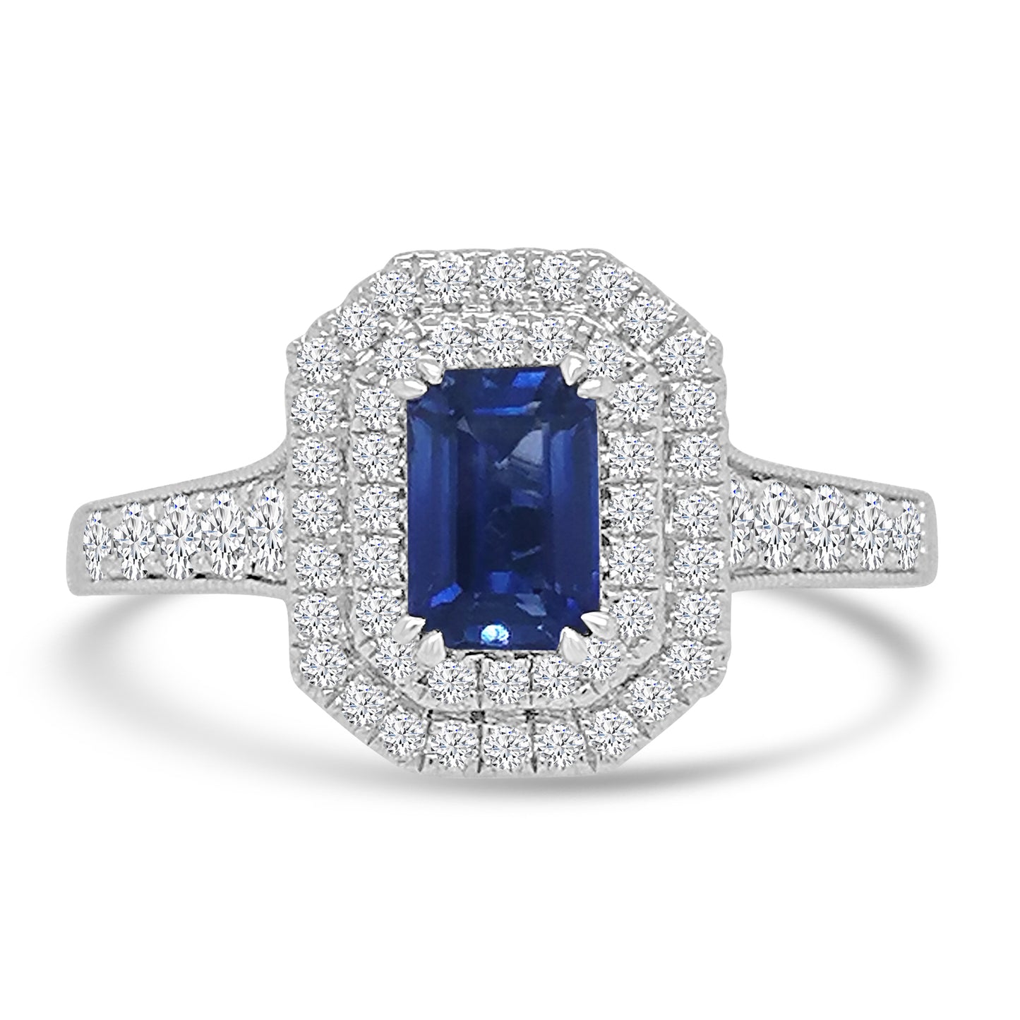 This ring is part of our coloured stone collection, set with a 0.74ct emerald cut blue sapphire. Hallmarked 750 18ct white gold mount with a 0.58ct double halo and split diamond set shoulders.