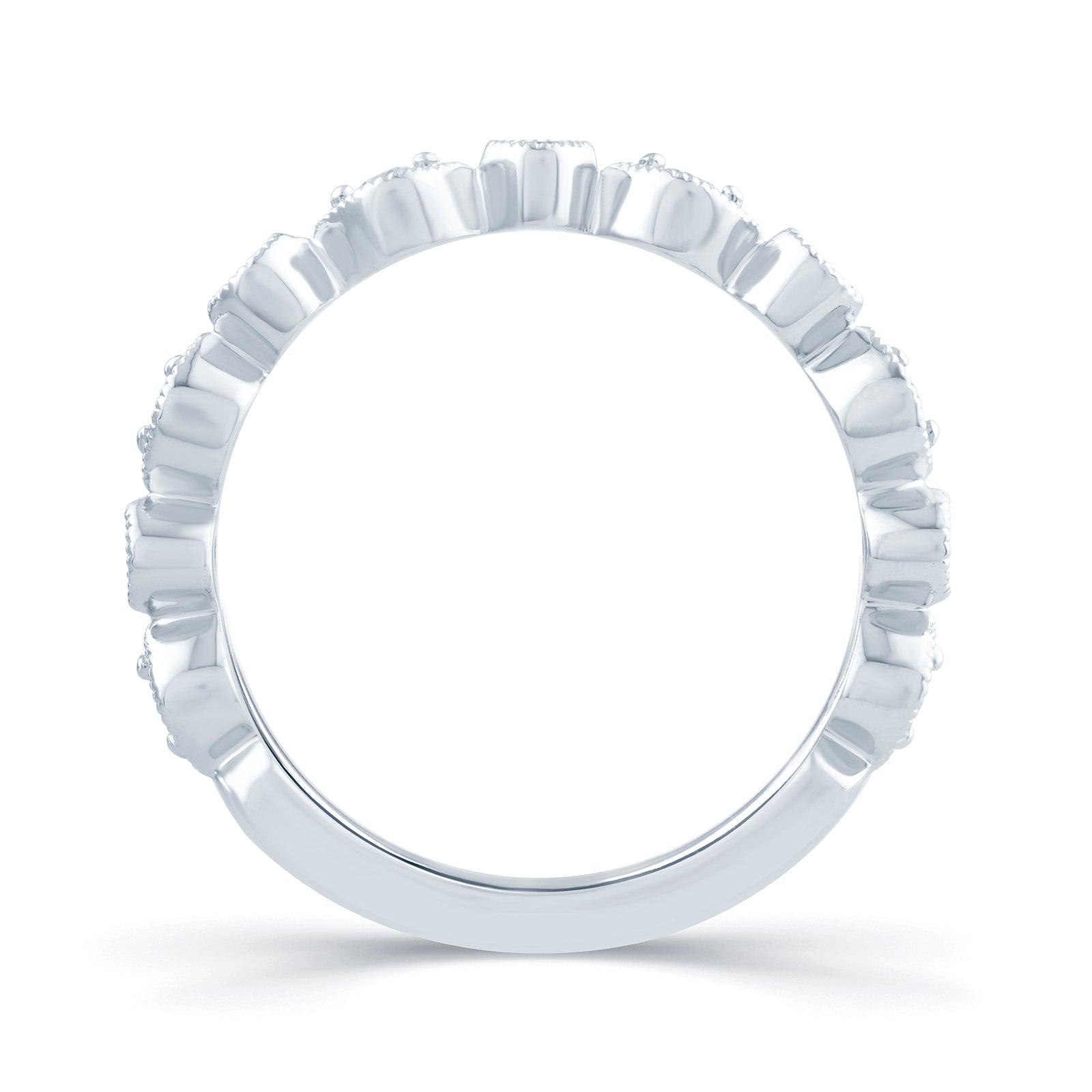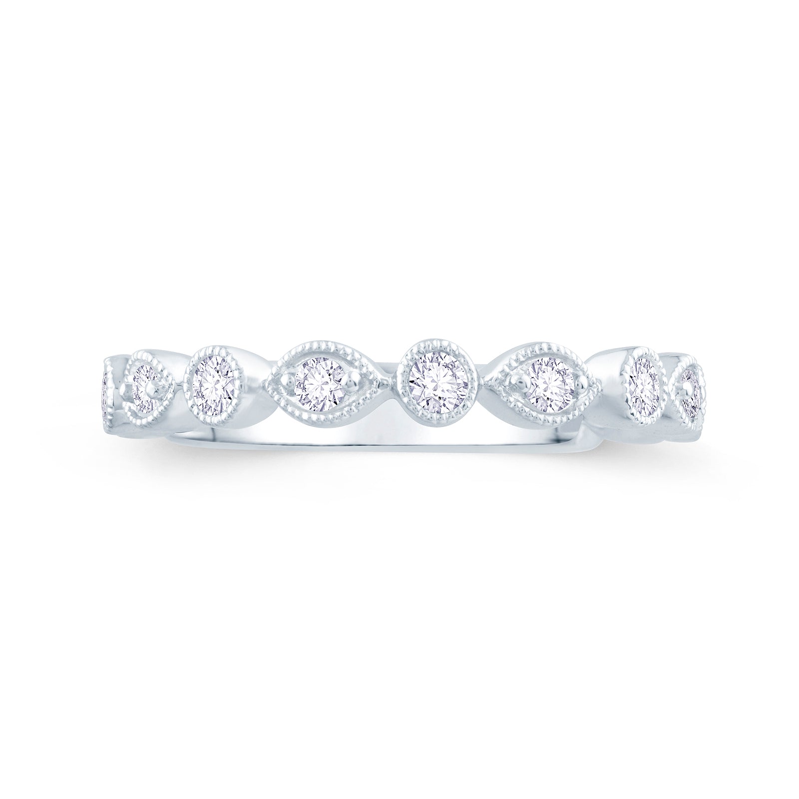 This fancy cut band consists of 0.25ct brilliant cut diamonds, set into a 2mm round and marquise setting giving the illusion of both marquise and round diamonds alternating across a 65% spread of the ring. This unique design also features an vintage bead edge around the diamond settings.