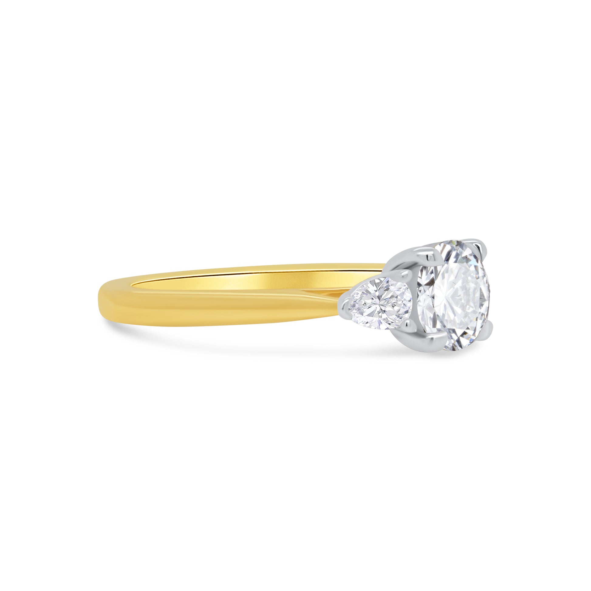 A beautiful three stone diamond ring with a commanding design. Crafted with a GIA certified 1.00ct brilliant round diamond that has been married with two complimenting pear cut diamonds. The pear cut side diamonds are set in a horizontal poisiton that creates a alluring,  yet slimming composition that makes a delicate and commanding design. Presented on a 750 yellow gold band with a platinum mount.