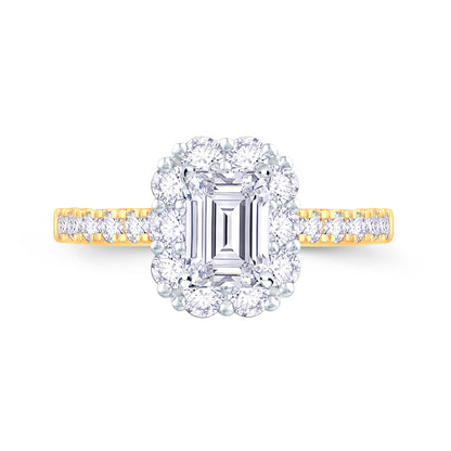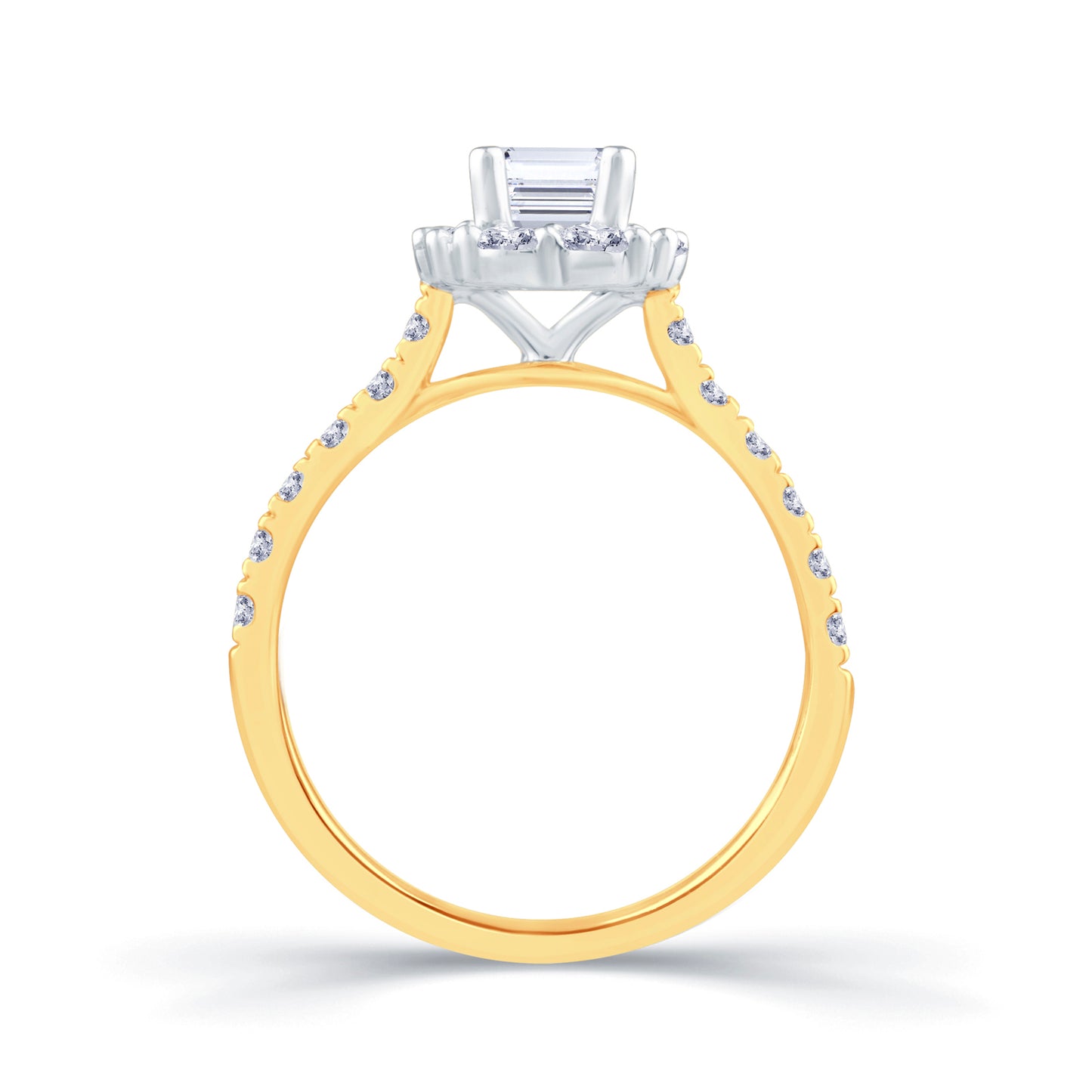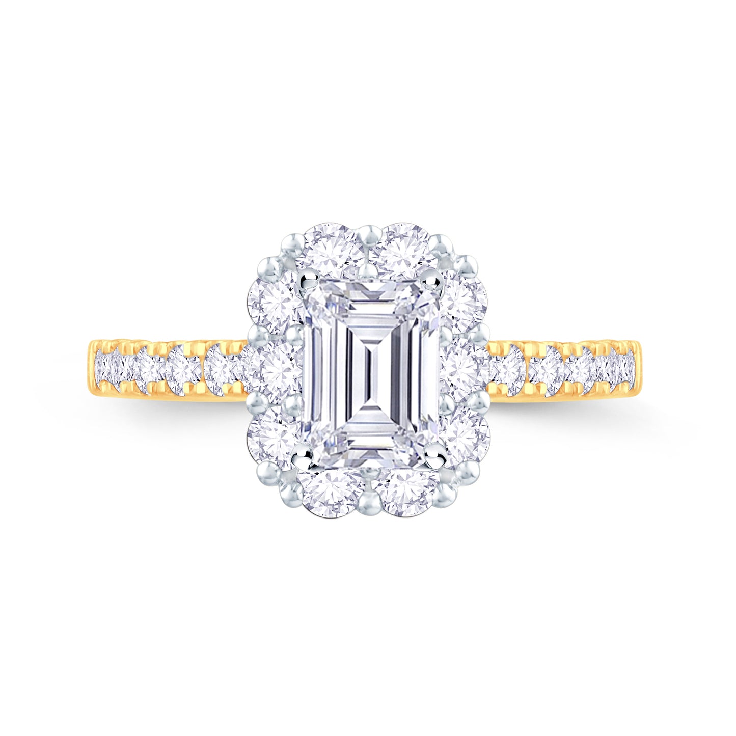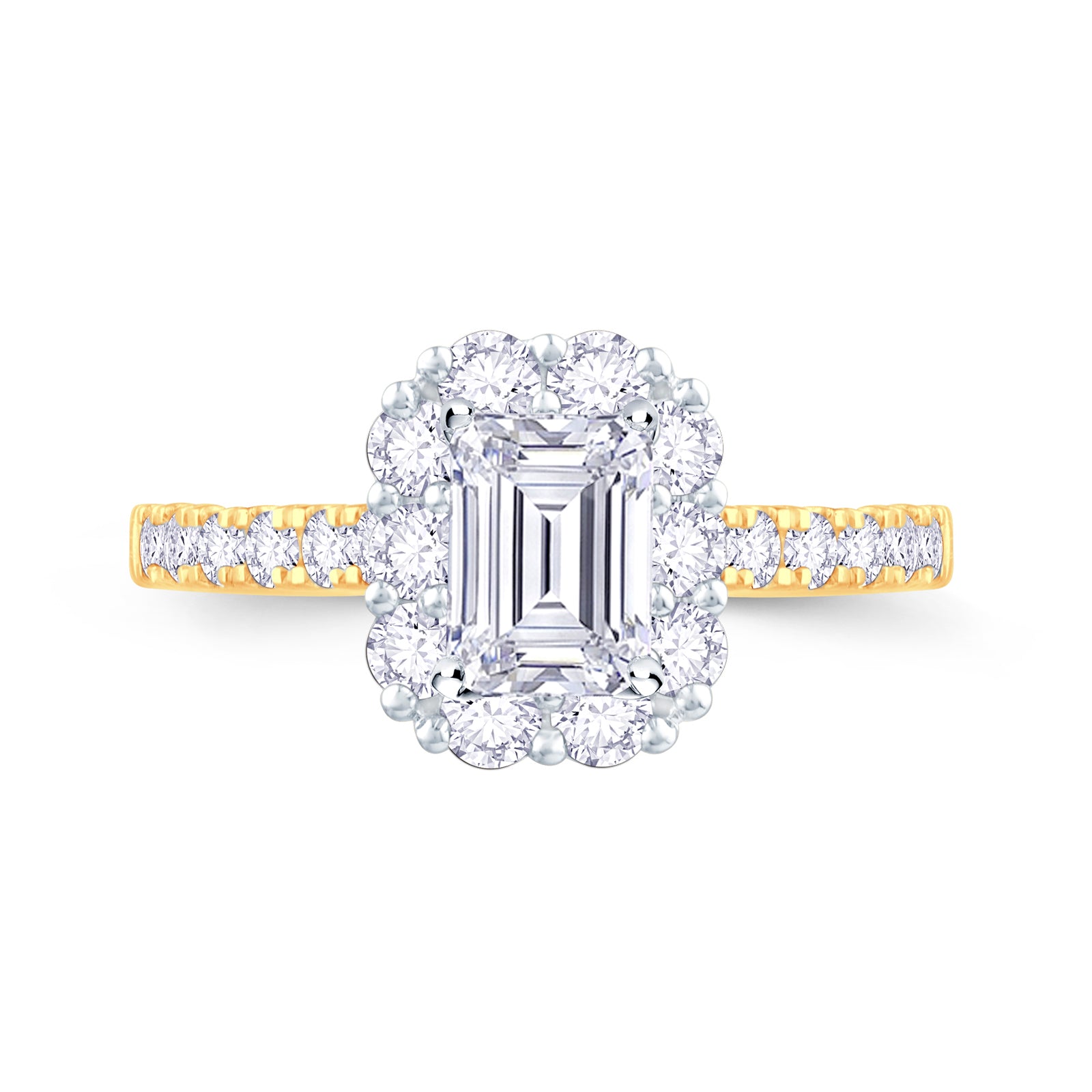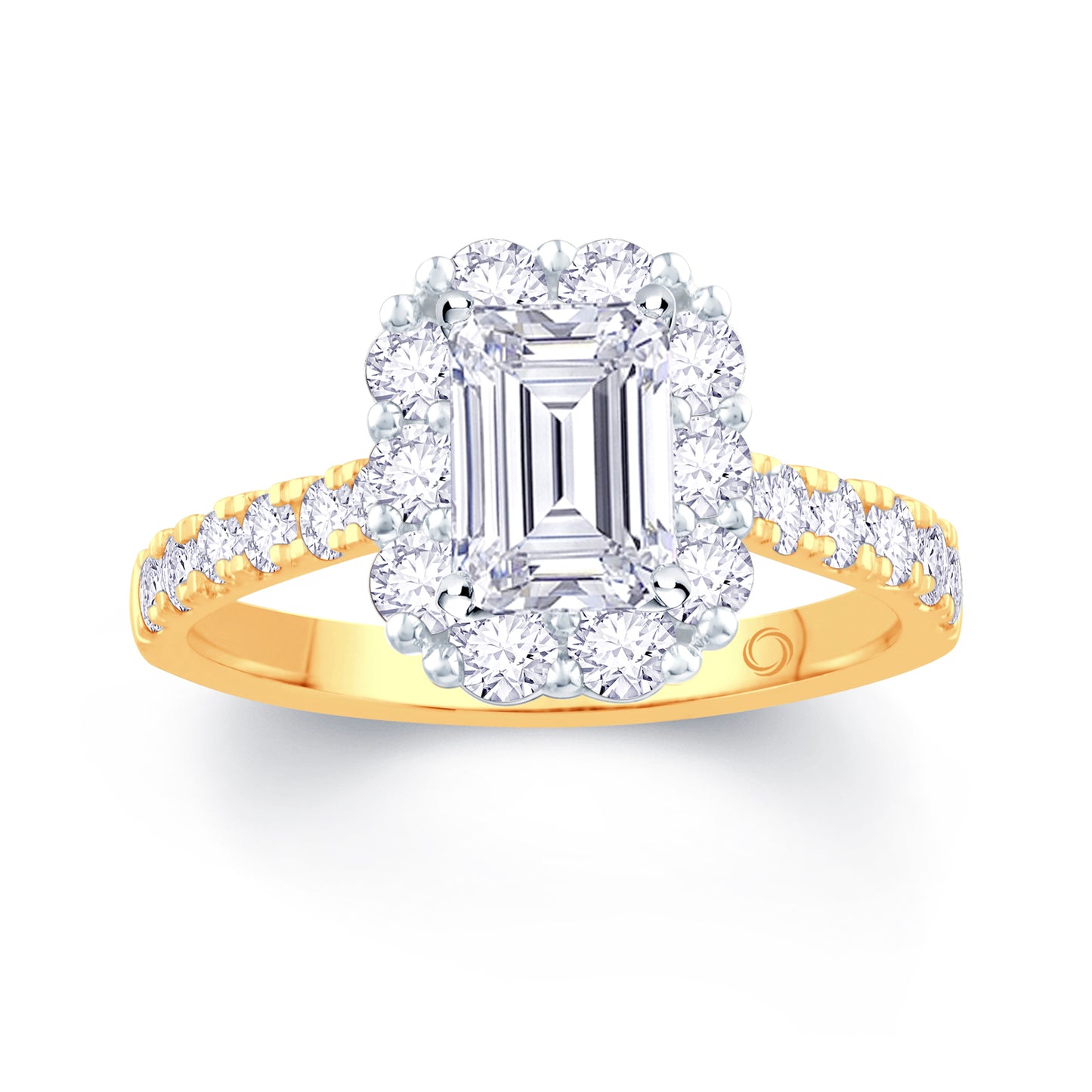 A timeless yet contemporary engagement ring. Set with a 0.71ct Emerald diamond. The emerald centre diamond is encased in a 0.80ct diamond halo, which travels down the band shoulders. Presented in a hallmarked 750 yellow gold band with white gold mounts.