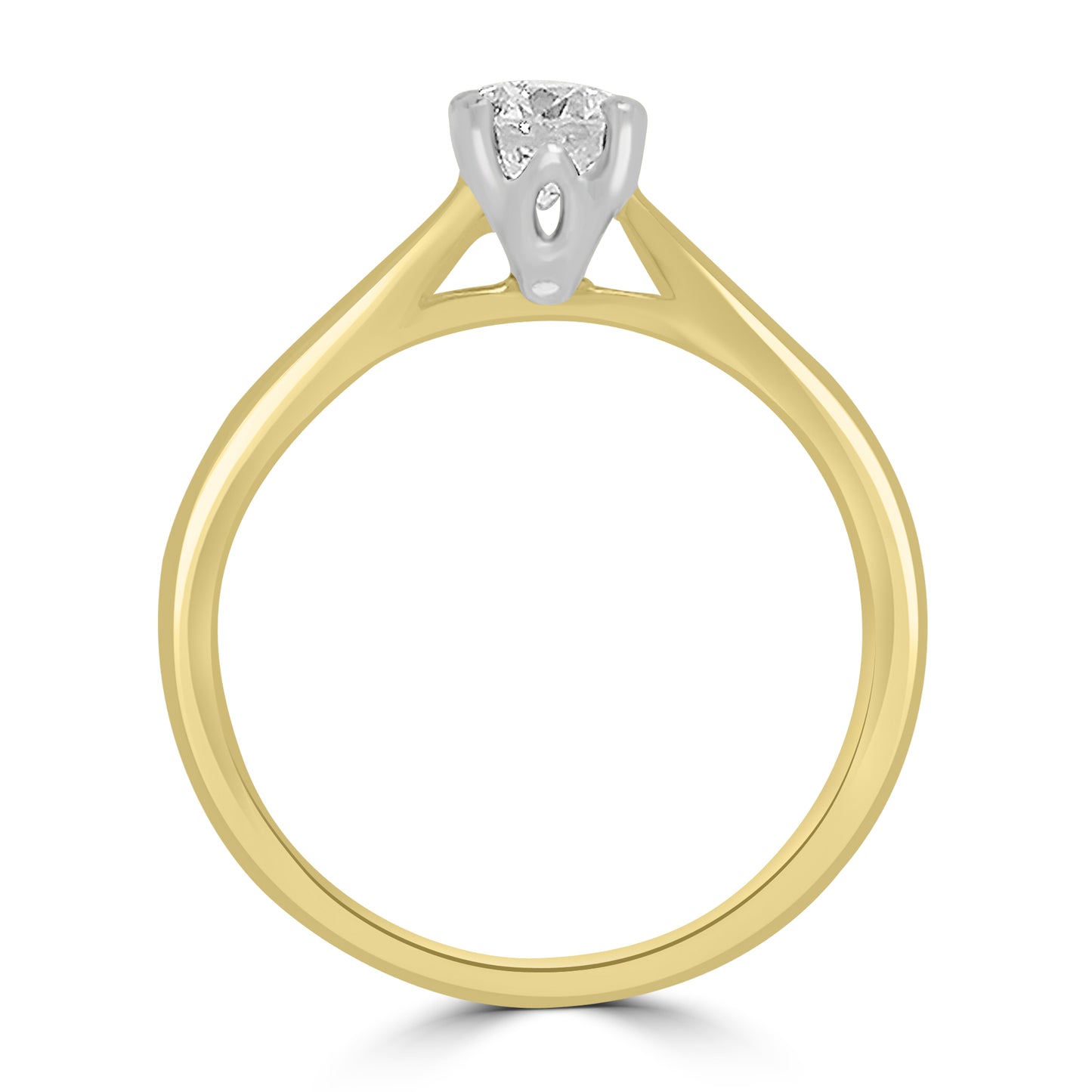This classic four claw diamond solitaire engagement ring is set with a GIA certified 0.45ct brilliant round cut diamond in a four claw mount. Hallmarked 750 yellow gold plain mount, with platinum caws securing the diamond.