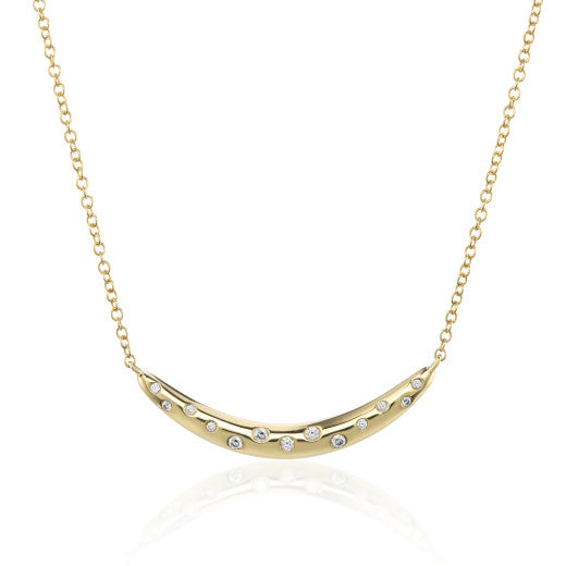 This beautiful yellow gold necklace features a sleek and modern curved pendant, embellished with sparkling diamonds. This necklace adds a touch of sophistication to any outfit and any occasion.