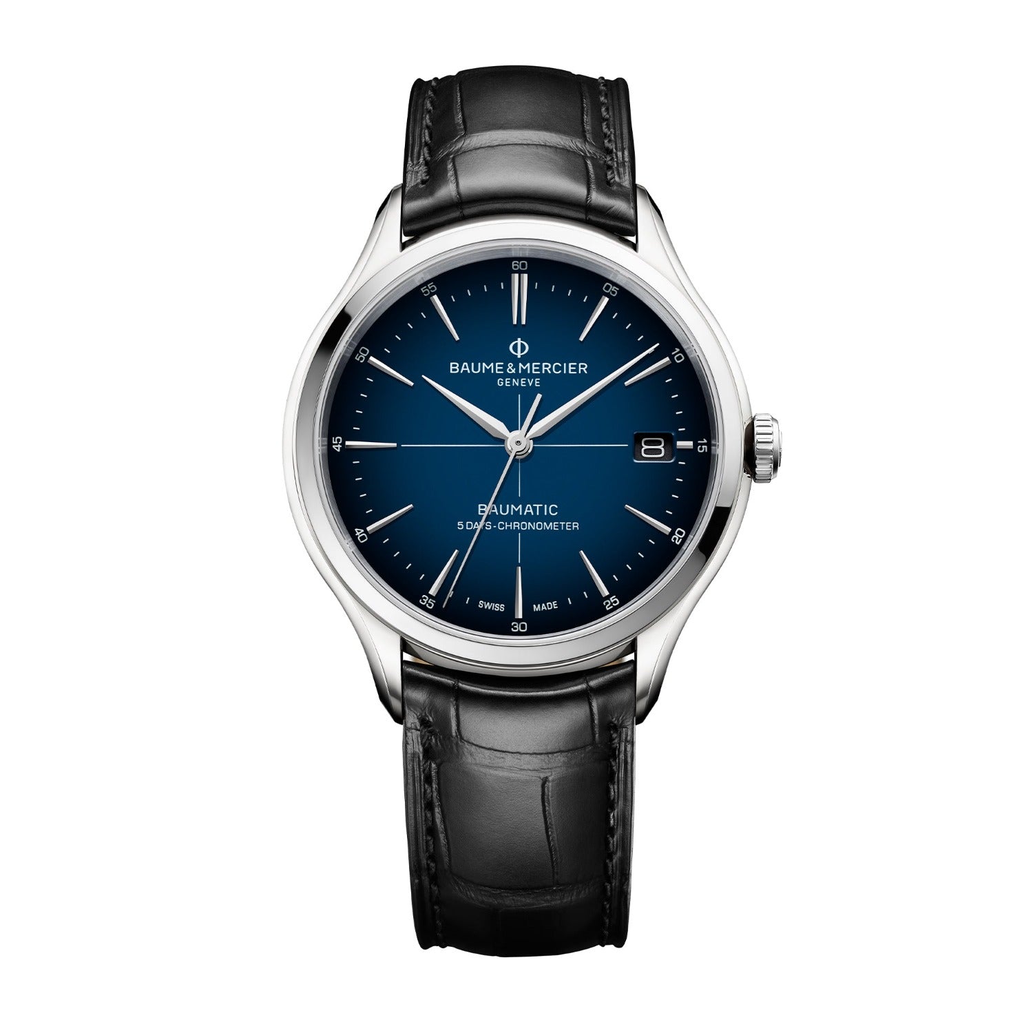 A Swiss chronometer watch for men, the Clifton Baumatic 10467 and its manufacture automatic calibre Baumatic is a fitting timepiece for the modern individual. It features a gradient blue dial paired with a satin-finished stainless steel case and a finely-stitched black alligator strap.