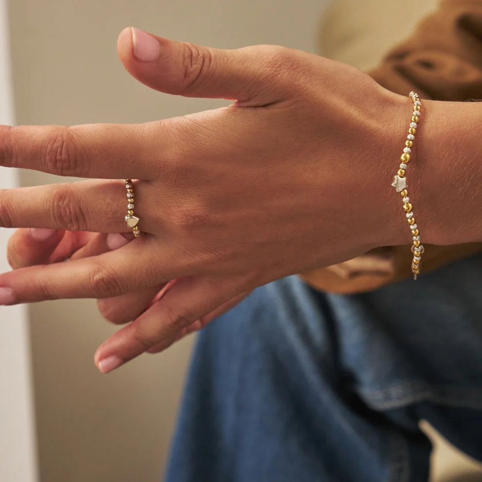 Crafted in radiant gold and silver with sparkling beads, this mixed-metal bracelet balances contrast and harmony in one timeless design. At its heart lies an inset star, a symbol of guidance and trust, serving as a reminder to follow your inner compass, keeping faith that every step will lead you towards your true path. Presented on 925 Sterling Silver & 18ct Gold Plated.
