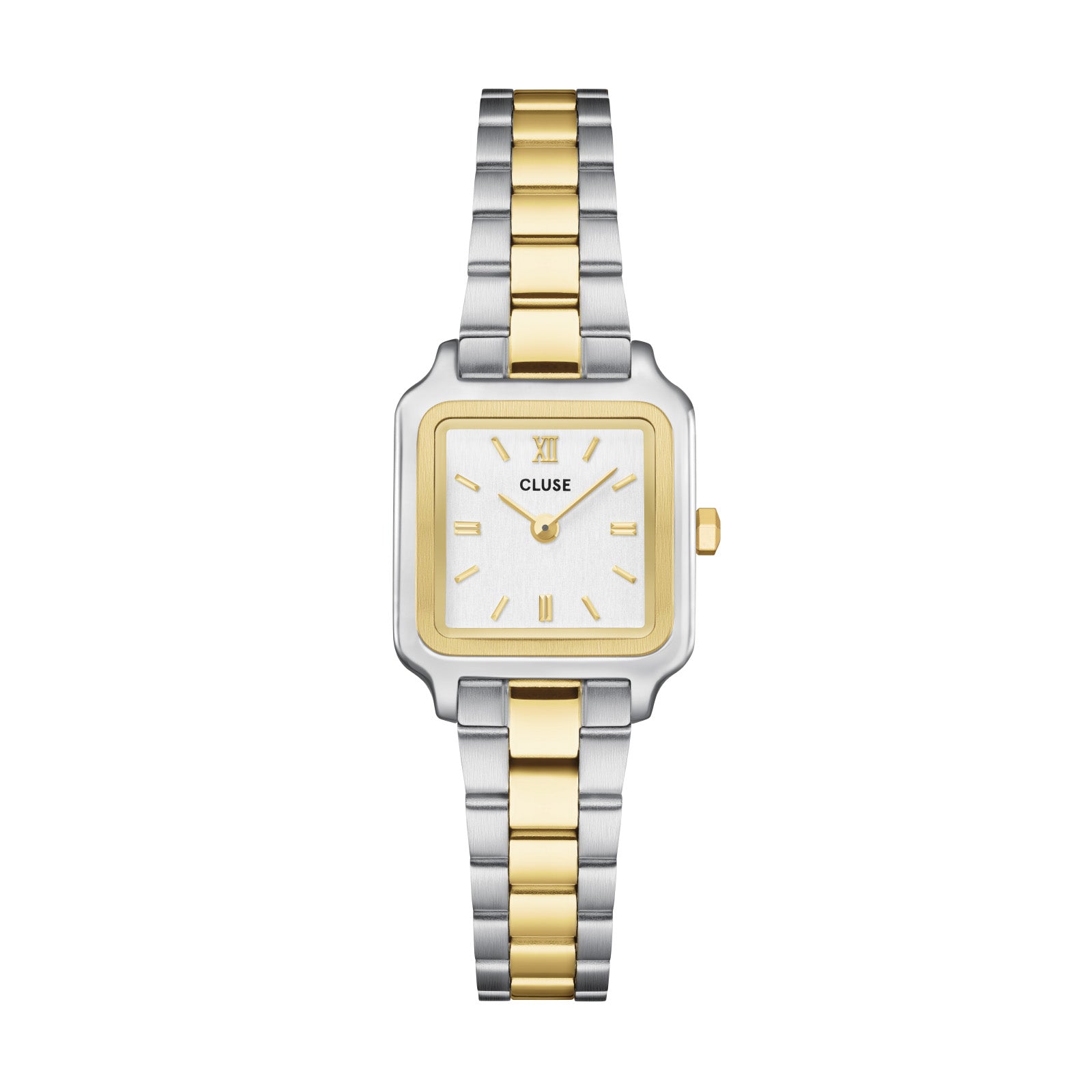 Elevate your everyday look with this piece from the Gracieuse Mini collection by Cluse, for women. Featuring a refined and timeless 21mm silver and yellow gold-coloured square case, a comlimenting crisp brushed white dial with yellow gold toned accents. The 12 mm strap features a silver coloured matte outer link and a polished yellow gold-toned stainless steel link strap, this timepiece is perfect for those who appreciate elegance with a modern touch.