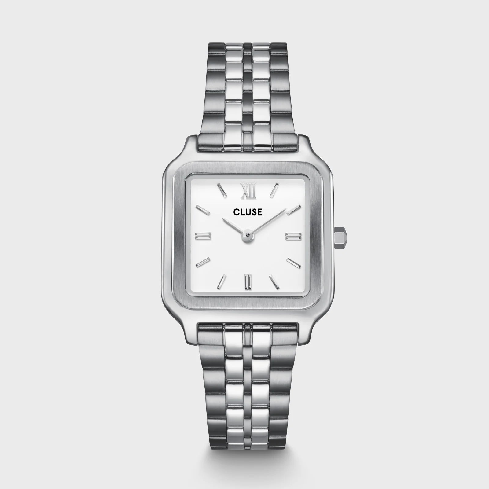 Add a sense of luxury and sophistication to your look with the Cluse Gracieuse Silver Steel Link Watch. Featuring a sleek silver-toned square case, a crisp white dial, and a polished stainless steel link strap, this timepiece blends elegance with modern refinement. Designed for versatility, you can easily customize the look with any 16 mm strap and adjust the size yourself for the perfect fit.