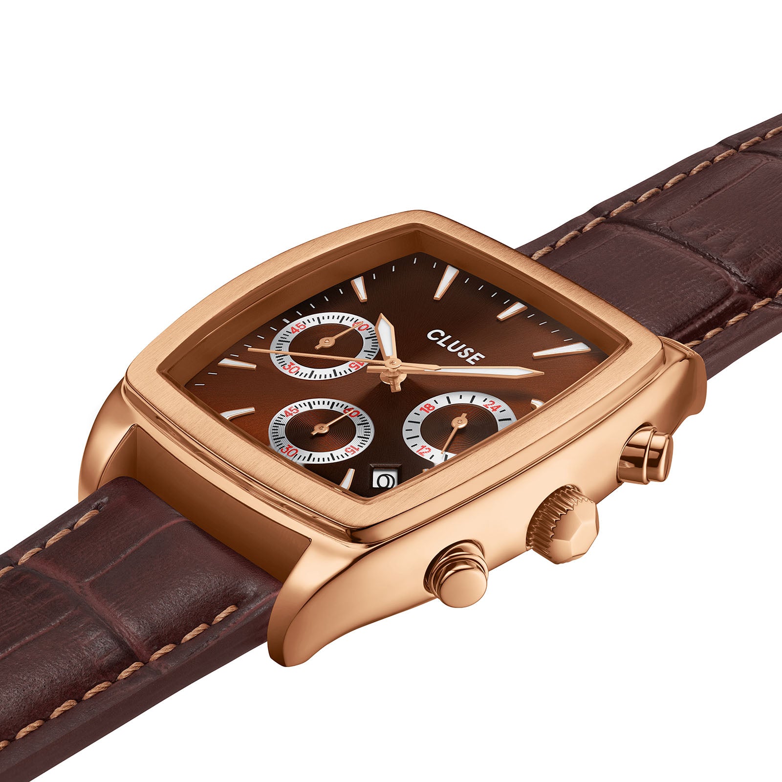 A bold, outspoken but effortless design from Cluses Quartaut collection. This watch for men is the epitome of style and quality. With a rectangular shaped 35mm case, the dial features a sunburst brown face with chronograph features. To tie in the colours, the dial is accented with silver and red around the sub-dials, and a complimentary rose tone. The case is crafted with a rose gold tone and compliemented by a alligator leather strap. A harmoinious display of colours, tones and designs, brought to gether to create a effortless timepiece worthy of any collection.