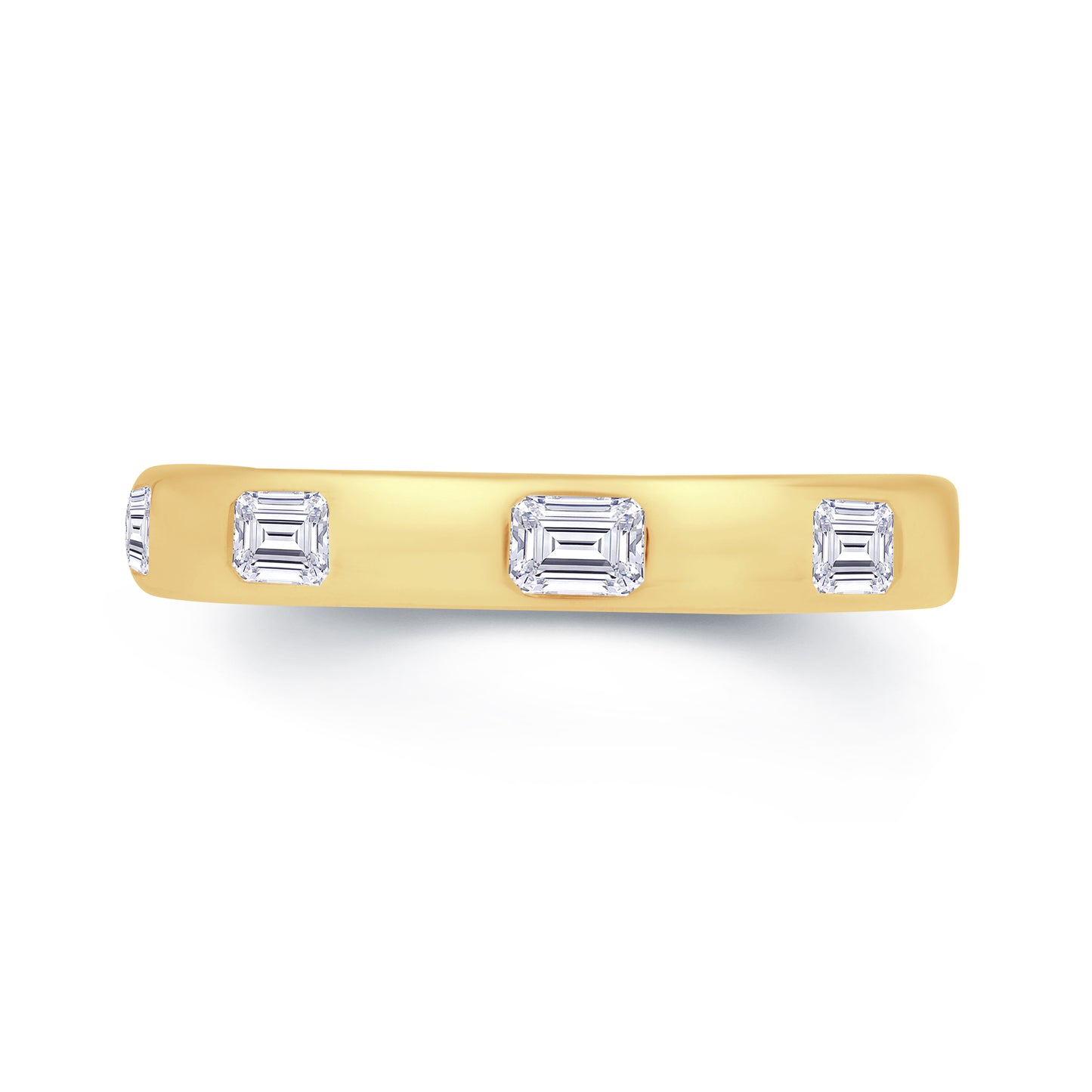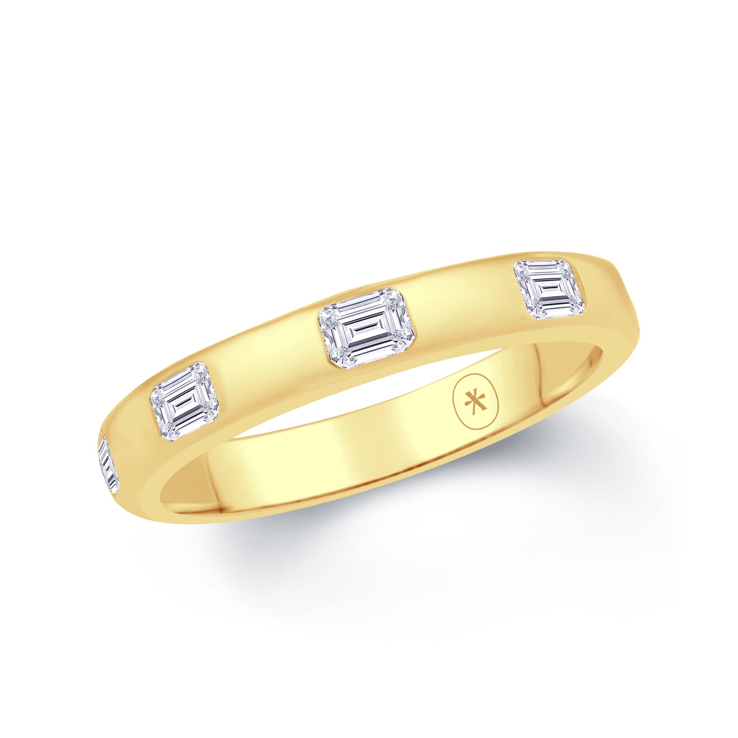 This 3mm 18ct yellow gold band consists of 5x Emerald cut diamonds totalling 0.45cts, in a rub over setting.