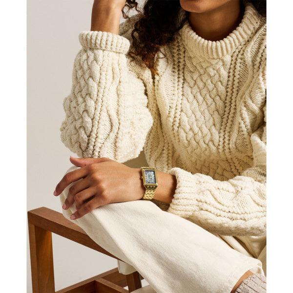 A rectangular gold-tone stainless steel case pairs seamlessly with a matching bracelet for a polished and cohesive design. The glossy black mother-of-pearl dial adds depth and subtle iridescence, complemented by three-hand functionality and a date display for everyday practicality. Thoughtfully crafted in premium materials, this mid-sized watch balances refined details and modern versatility. The rich black mother-of-pearl dial shimmers with understated luxury, while the gold-tone stainless steel bracelet elevates this timepiece into a statement of enduring style.