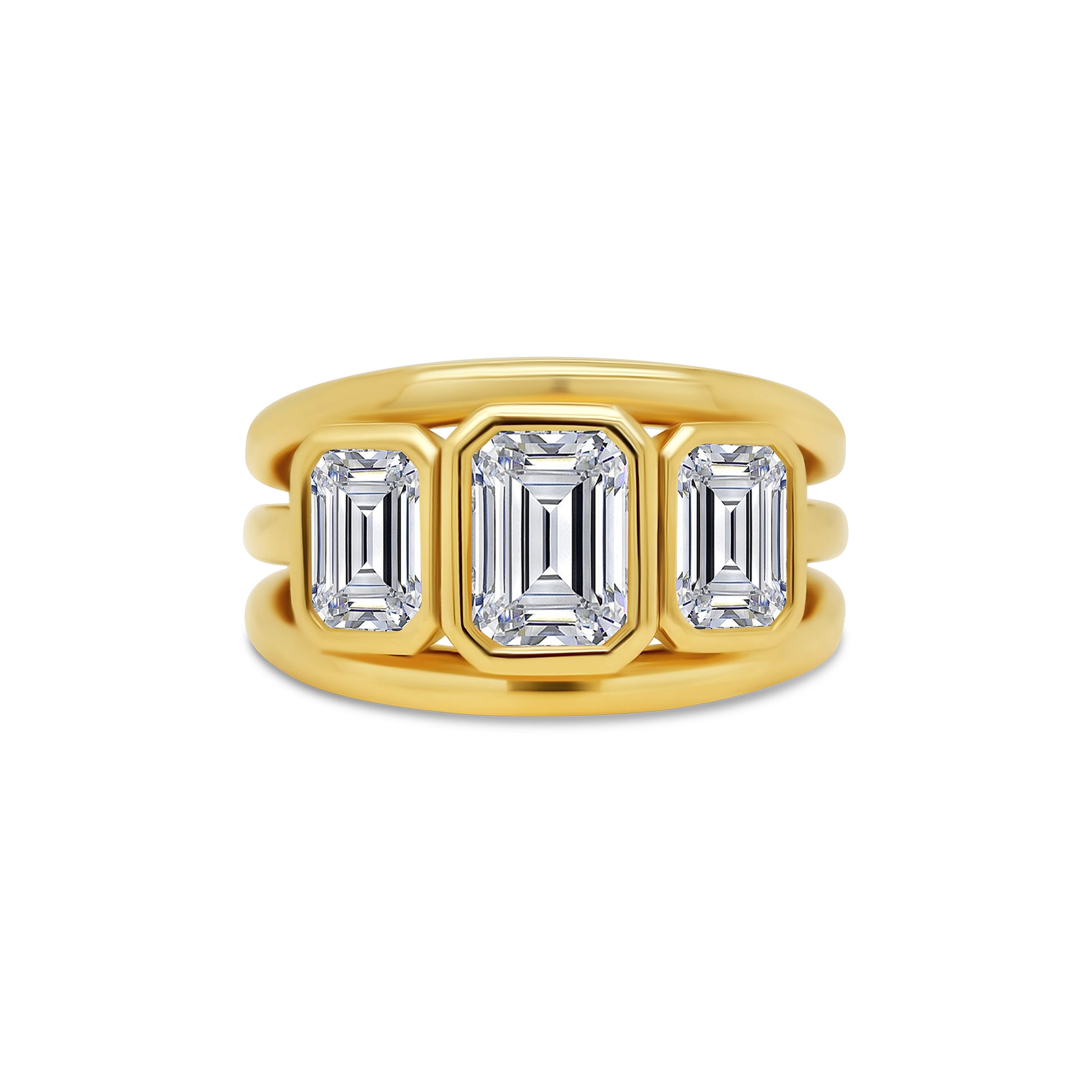 Laboratory Grown, Bezel Set Emerald Three Stone Diamonds, 18ct Yellow Gold Split Band Ring, 2.41ct