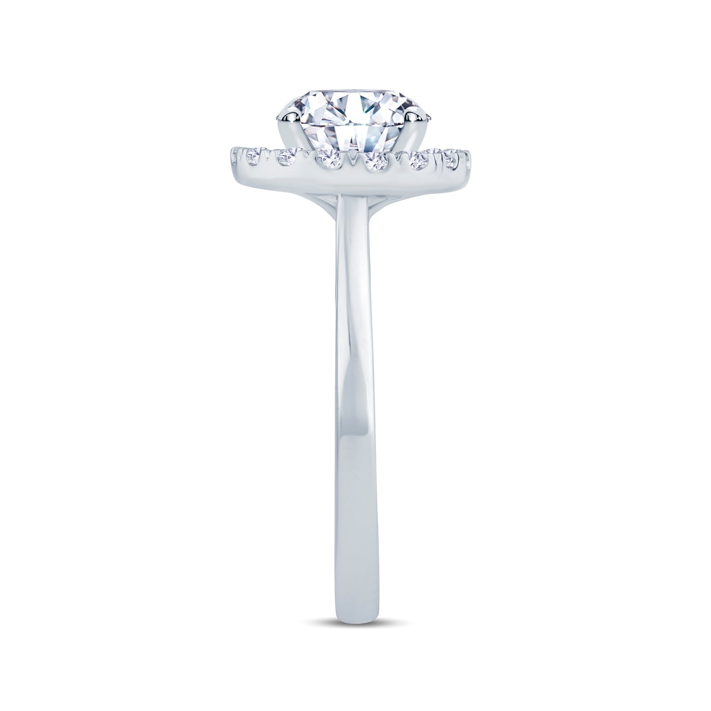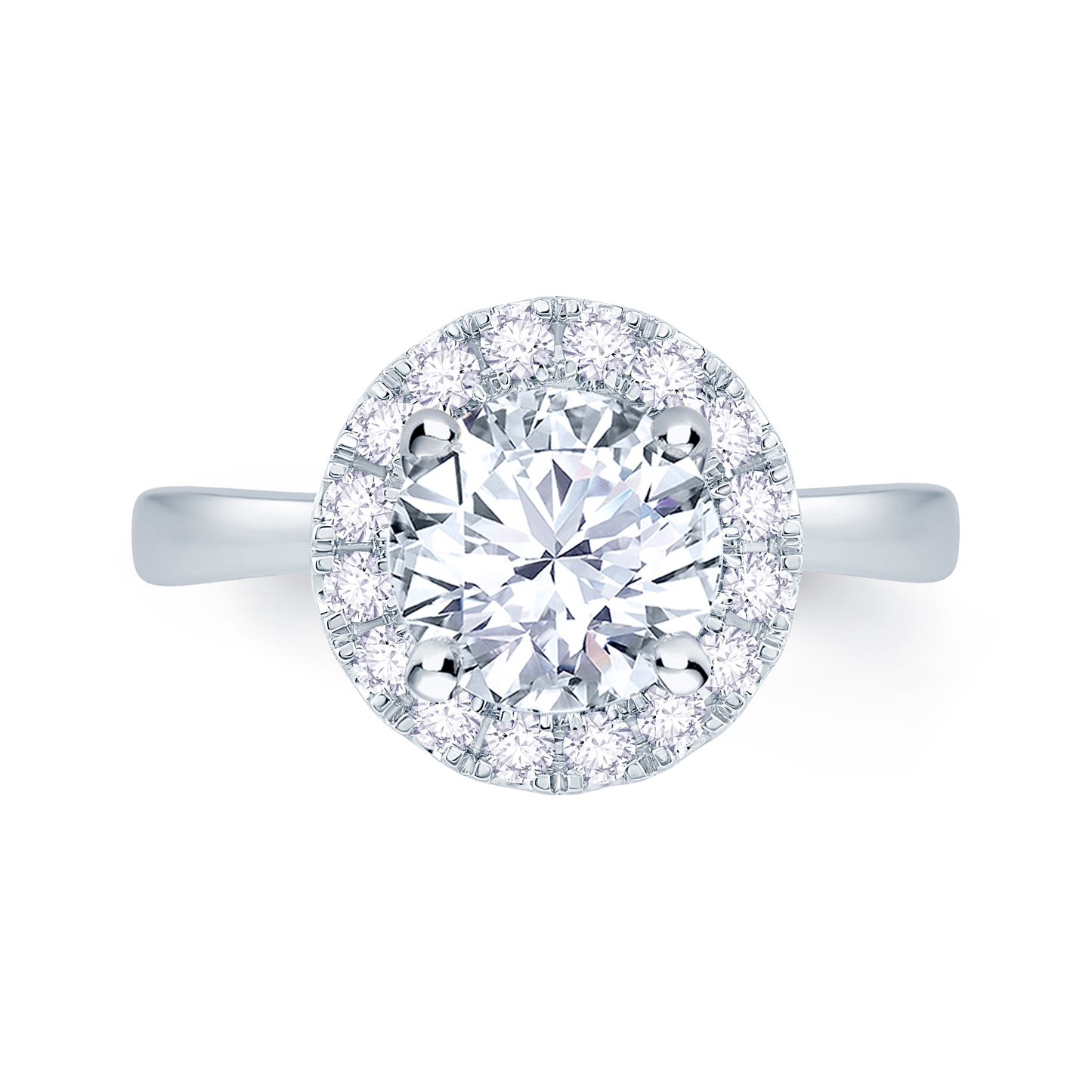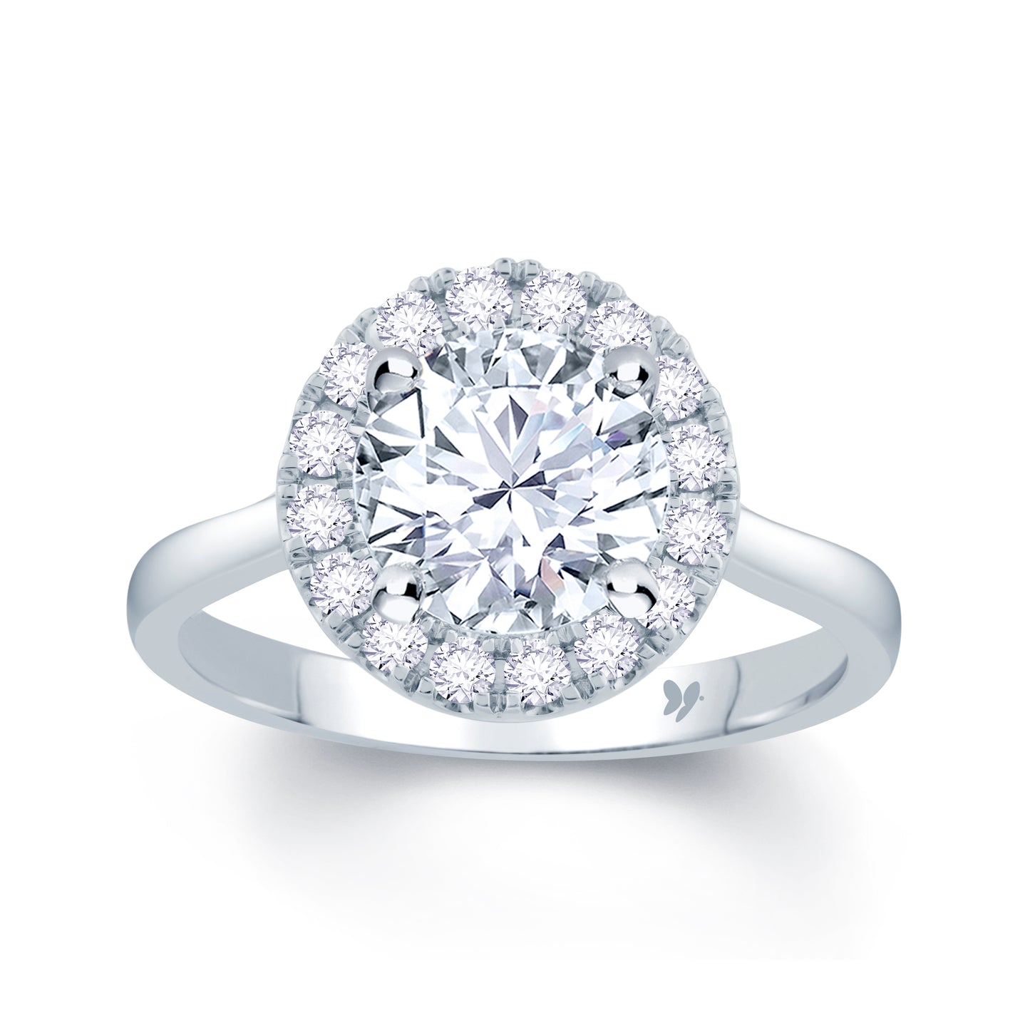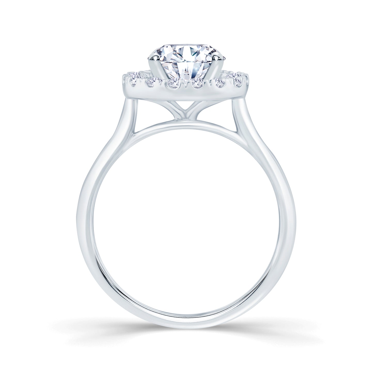 A 1.04ct laboratory grown brilliant round solitaire engagement ring, traditionally designed with a four claw setting and presented on a plain 950 hallmarked platinum band. Married with this centre stone is a complimenting laboratory grown diamond halo, adding 0.23ct. A timeless and classic choice for the one you love.