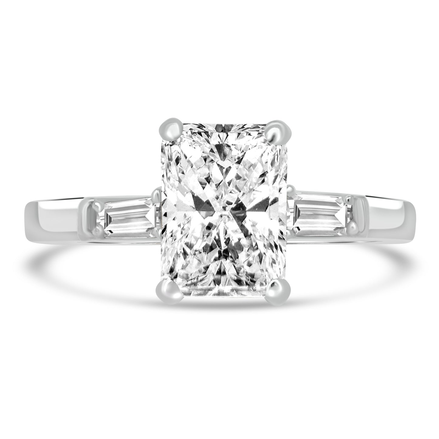 A laboratory grown radiant solitaire engagement ring that has a graceful tapered design. Crafted with a four claw setting holding a beautiful 1.50ct laboratory grown radiant cut diamond, with the ring shank holding tapered diamond on either end that adds a delicate character to this graceful ring. Side tapered stones add 0.18ct on either end, and being presented on a hallmarked 950 platinum band.