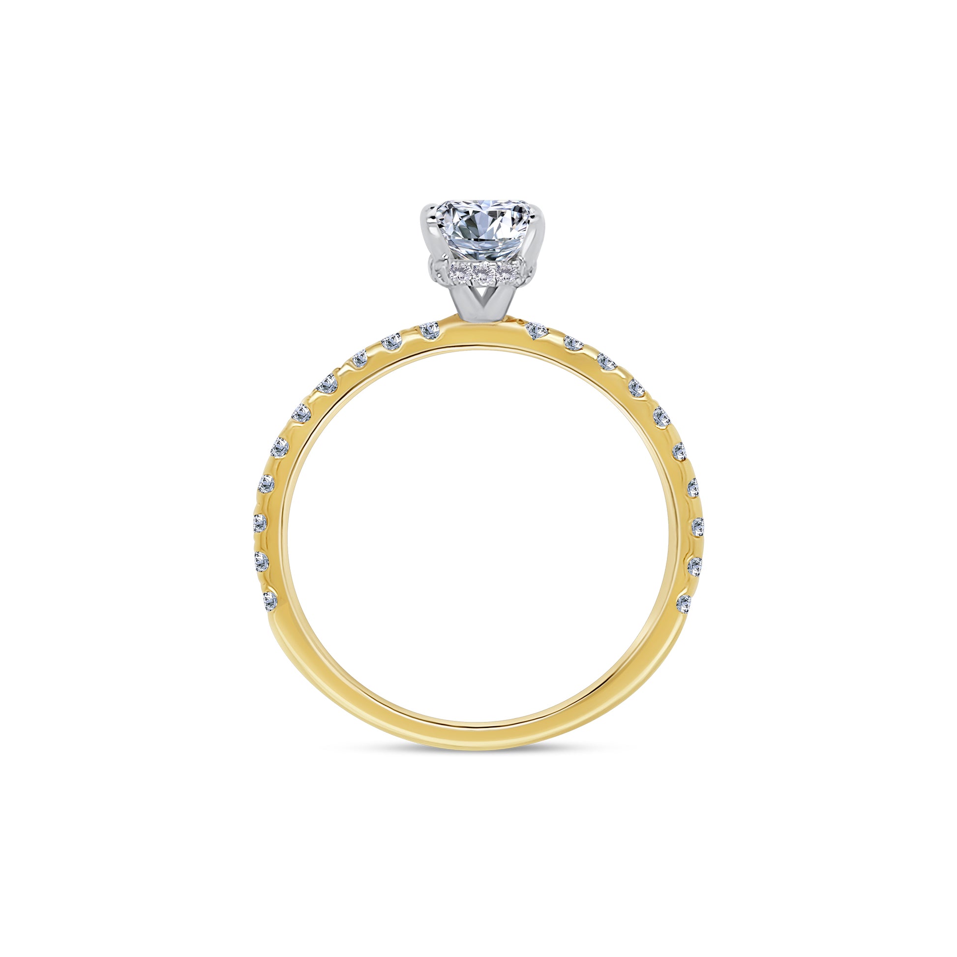 A timelessly crafted laboratory grown diamond solitaire ring. Crafted in a hallmarked 750 yellow gold band with a platinum setting, this ring features a elegant IGI certified 1.05ct oval cut laboratory diamond set in a raised rounded claw setting. Attached around the base of the mount is a hidden halo of brilliant round laboratory diamonds, adding a gracefulness to the elegant composition and 0.40ct of diamonds.