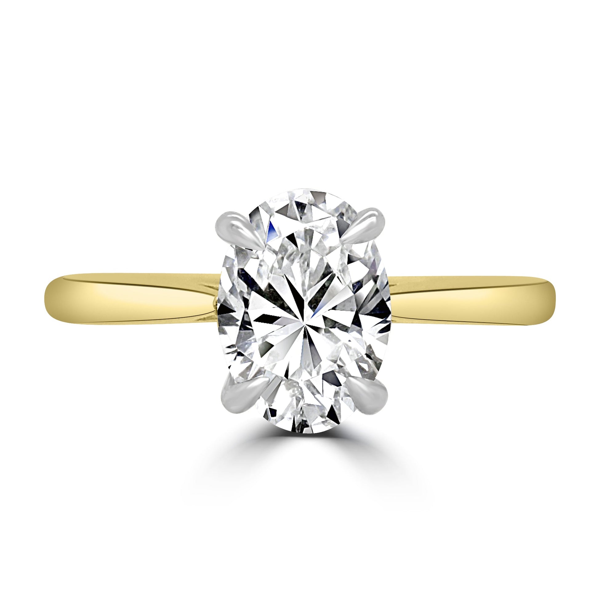A timelessly crafted laboratory grown diamond solitaire ring with a touch of added grace.  Crafted in a hallmarked 750 yellow gold band with platinum setting, this ring features a elegant IGI certified 2.05ct oval cut laboratory diamond set in a talon claw setting. The added grace is applied through the subtle diamond detailing along the settings bridge, along either side of the band - this adds 0.05ct. Sure to hold its elegance due to its timeless and delicate style.