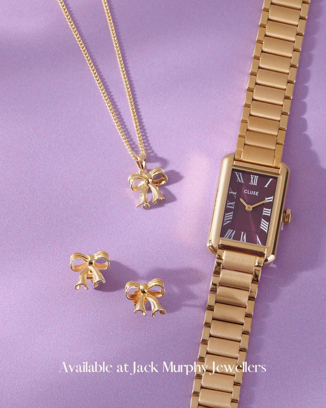 Add a touch of luxury to the everyday with this stunning trio. Featuring a Cluse Gold Toned Burgundy Dial Watch with a matching set of Yellow Gold Plated Bow Pendant Necklace and Bow Stud Earrings. A timeless set that brings every detail together, tied with love and style.