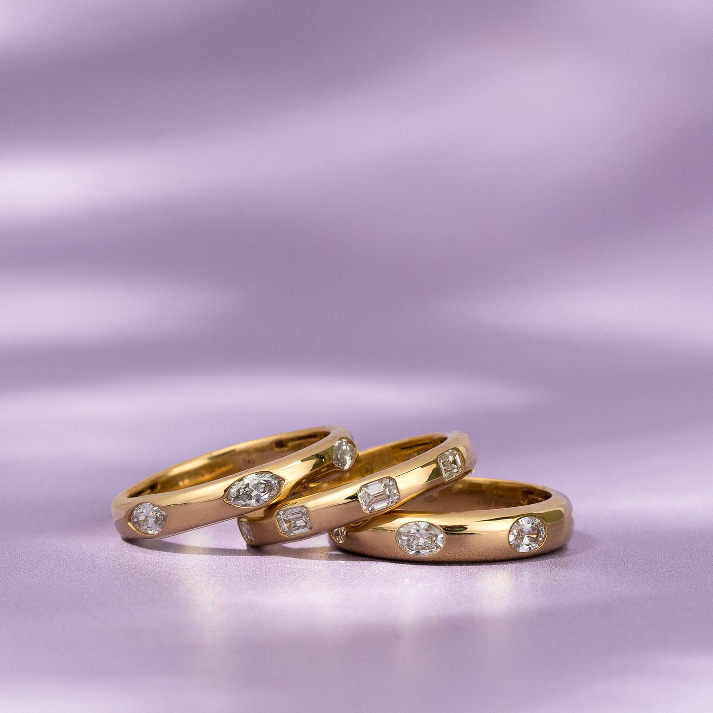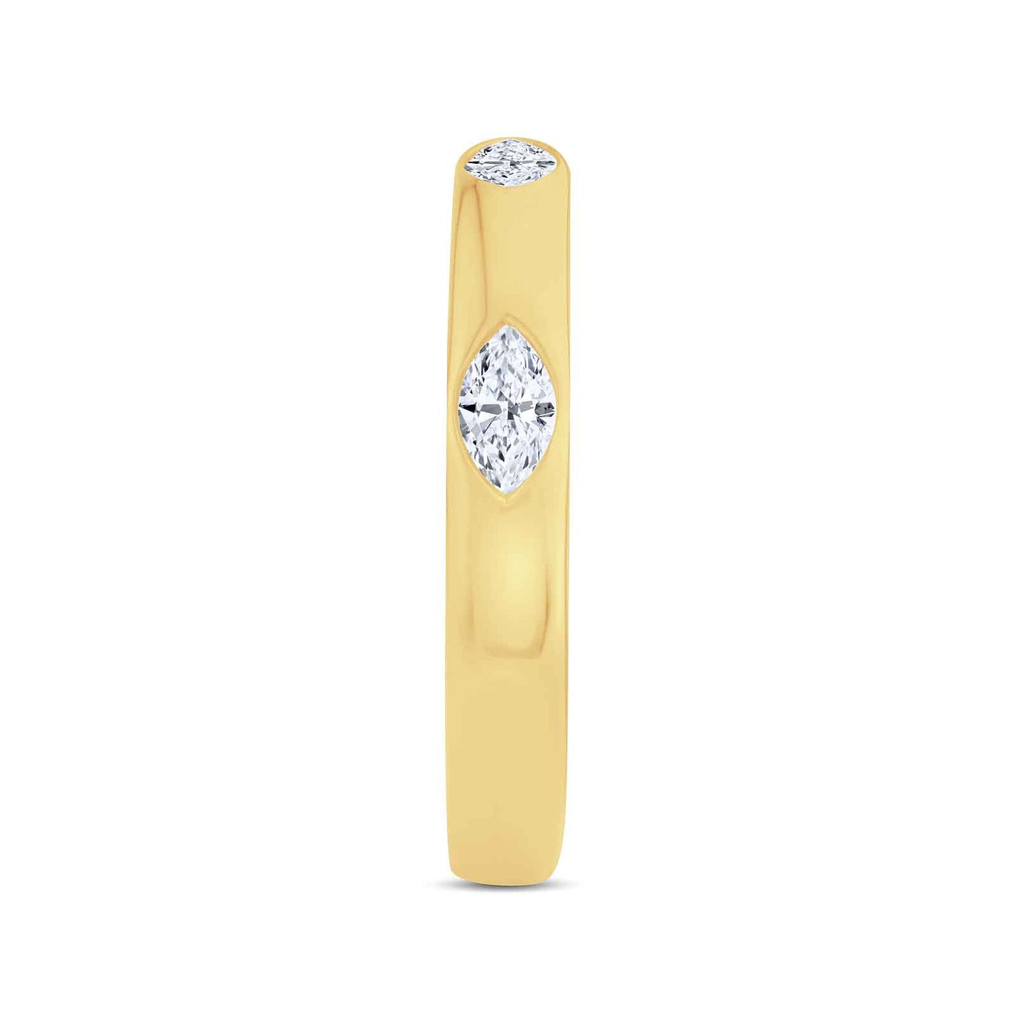 This 3mm 18ct yellow gold band consists of 3x Marquise cut diamonds totalling 0.30cts, in a rub over setting.