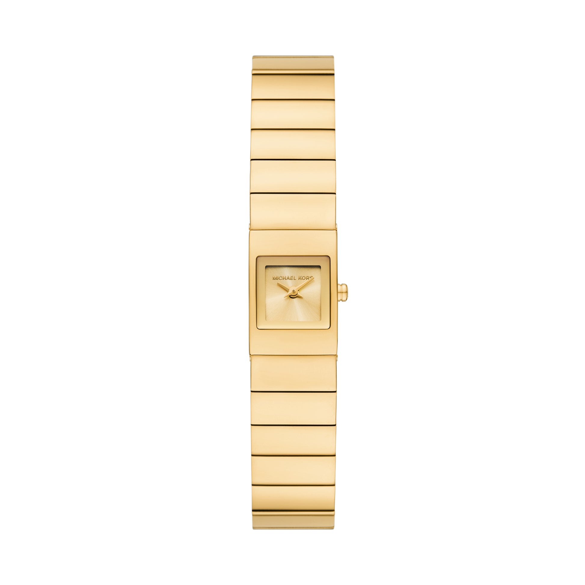 Make a lasting impression with the Michael Kors Darrington Ladies Gold Plated Square Dial Watch. This exquisite timepiece features a distinctive square gold-tone dial, offering a modern twist on classic elegance. The dial is beautifully complemented by matching gold-tone  hands, adding a refined touch to the watch's sleek, geometric design. The watch is finished with a polished gold-tone stainless steel strap, offering both durability and luxury, while ensuring a comfortable fit. With its chic square dial and versatile appearance, this watch is the perfect accessory to elevate any ensemble, whether for everyday wear or special occasions. Combining style, grace, and practicality, this watch is a must-have for any fashion-forward individual.