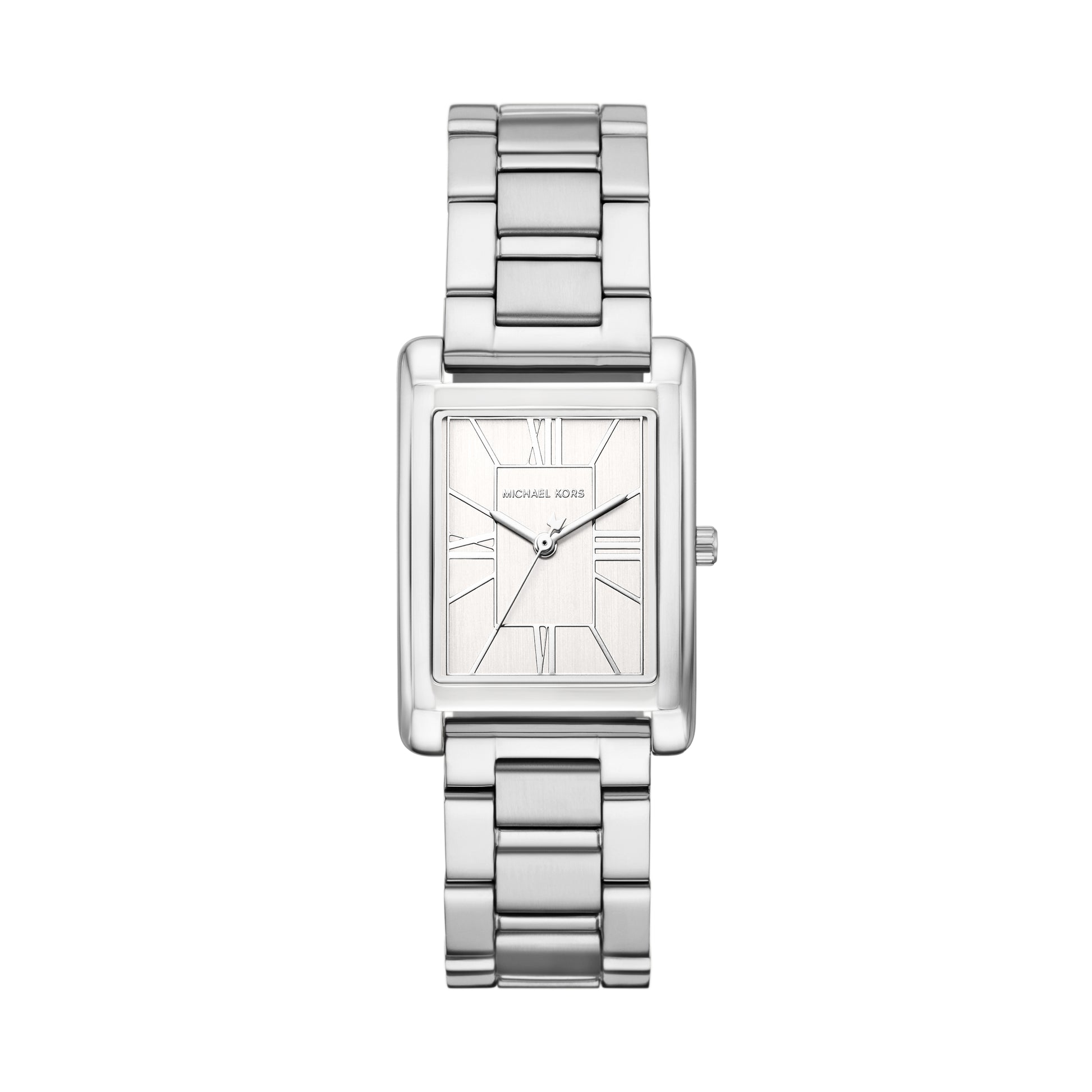 A sophisticated Michael Kors Essex watch, crafted with a sleek 26mm rectangular stainless steel case in a polished silver-tone finish. Featuring a precise quartz movement and a matching metal bracelet, this timepiece blends timeless elegance with modern durability. Water-resistant up to 5ATM, it’s ideal for everyday wear, adding a refined touch to any ensemble.