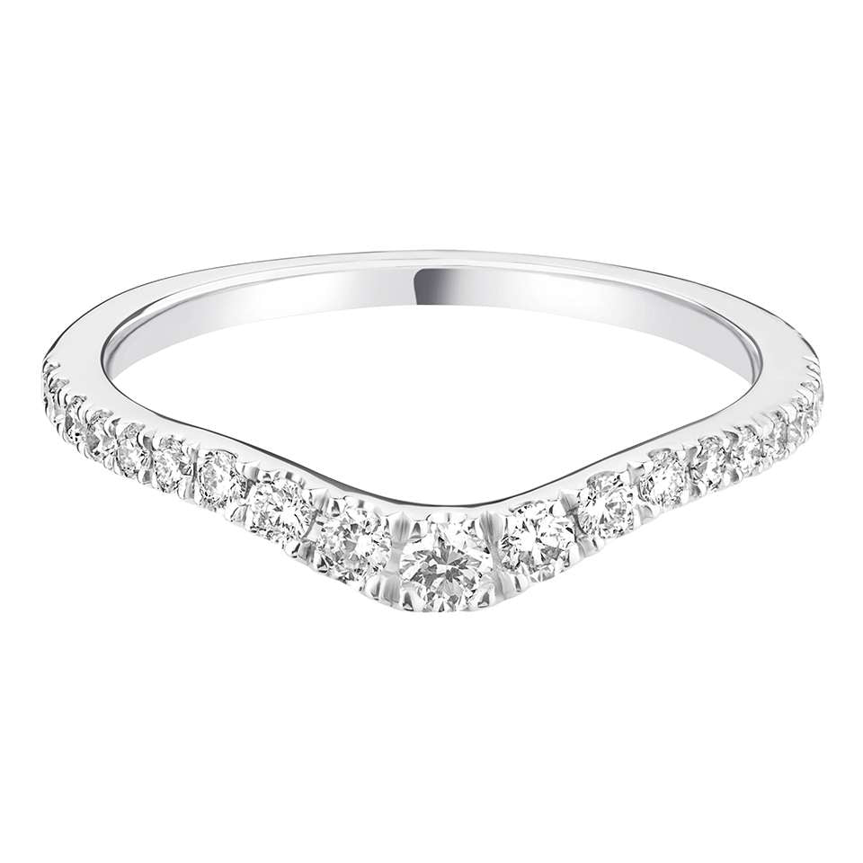 A elegant diamond ring, designed with a curved wave shape. This ring has a arched front section, which allows it to be uniquely suited for three stone engagement rings, however it gracefully fits with most style engagement rings. It has a 50% spread claw setting of brilliant round cut diamonds adding up to approx. 0.33ct. Presented on a polished and hallmarked 950 platinum band.