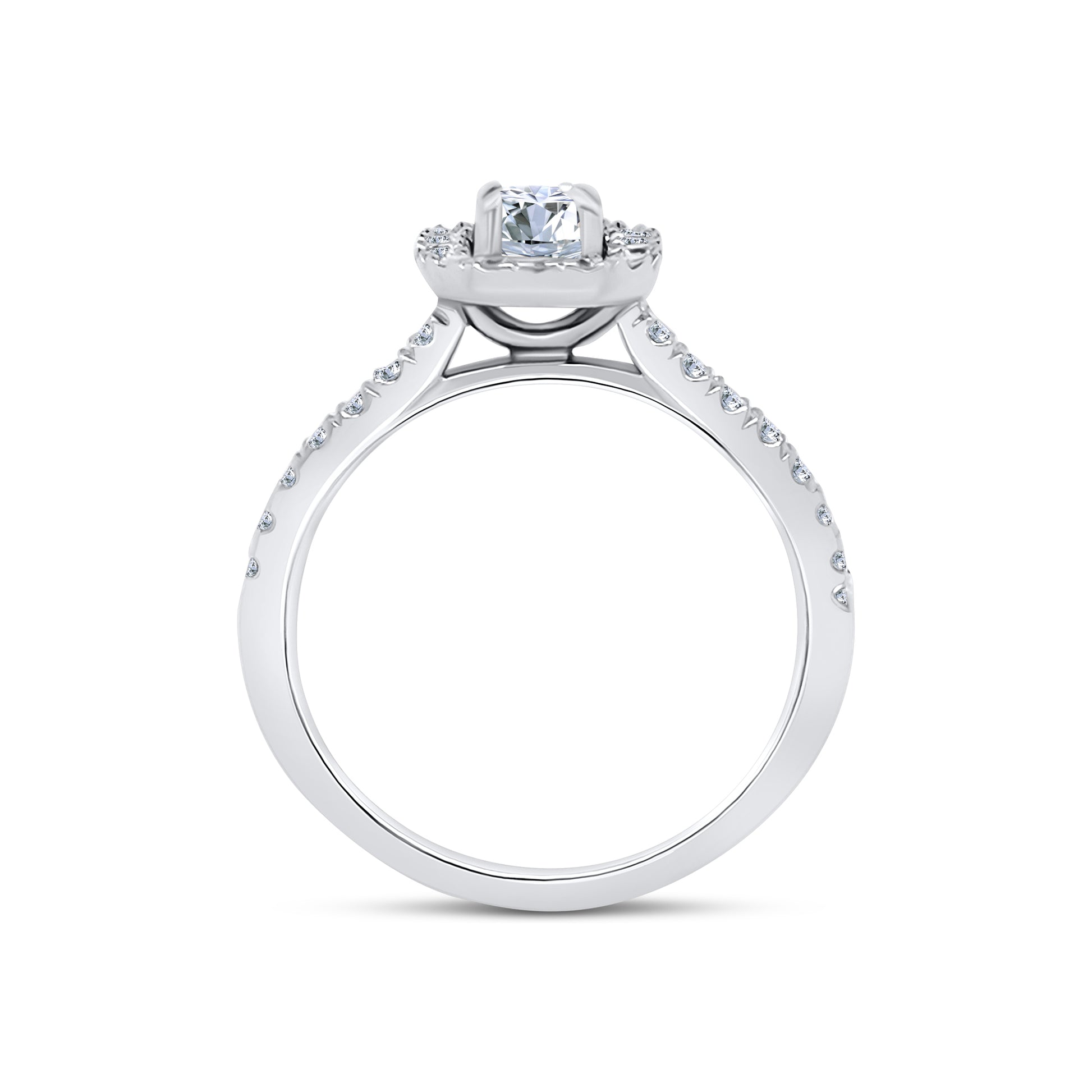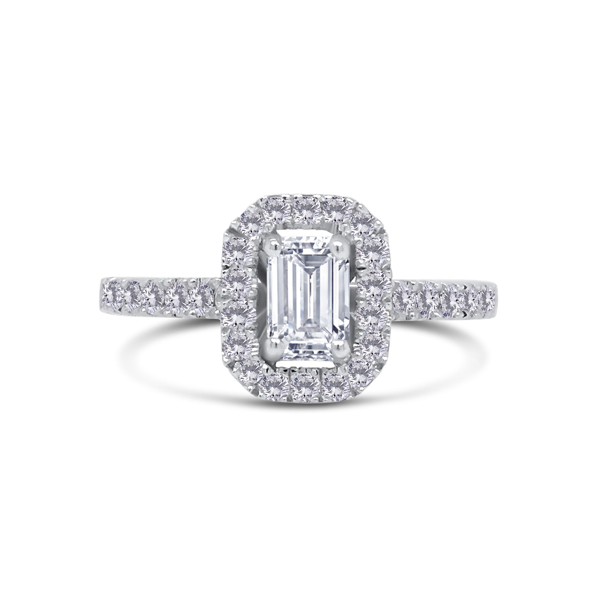 This exquisite diamond ring showcases a 0.50ct emerald cut diamond certified by GIA. A beautiful round cut halo is meticulously set around the centre stone, extending down the shoulders of the platinum band. The halo and diamond set shoulders add an additional 0.36ct. All set elegantly on a hallmarked 950 platinum band and mount.
