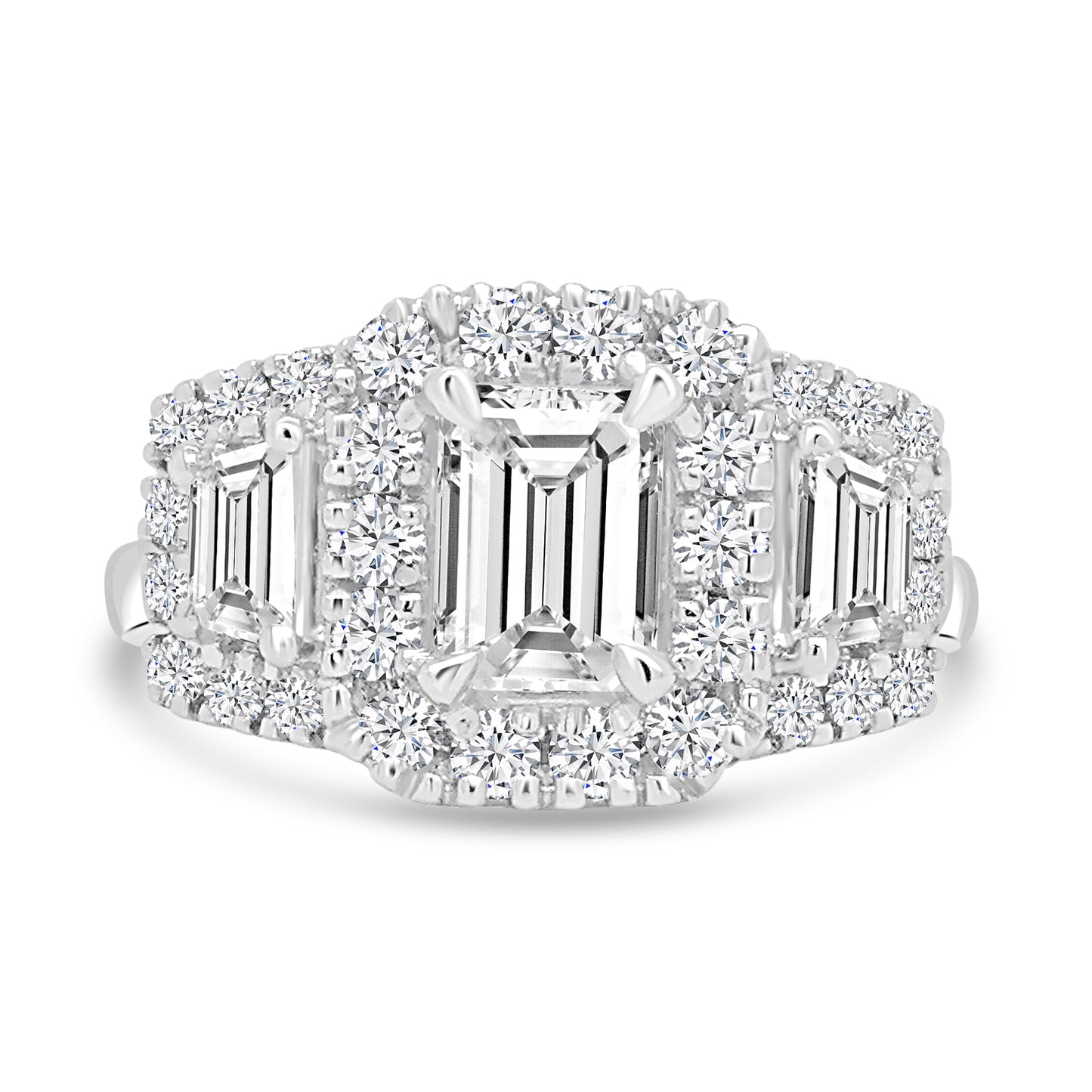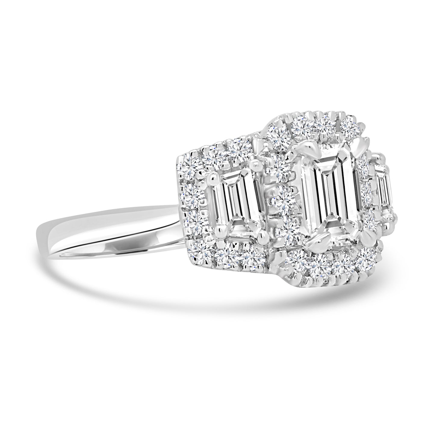 Platinum Emerald & Trapezium, Halo Three Stone Diamond Ring, 1.64ct