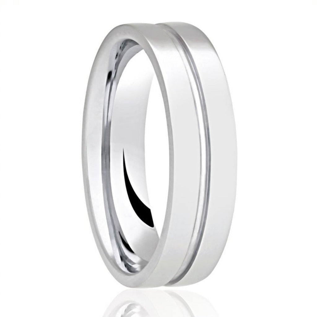Concepted to follow traditional means with a subtle inlaying of detail. This ring features a 6mm band crafted in platinum. Along the centre line of the band there features a inlaid groove that holds platinum adding the subtle modern touch.