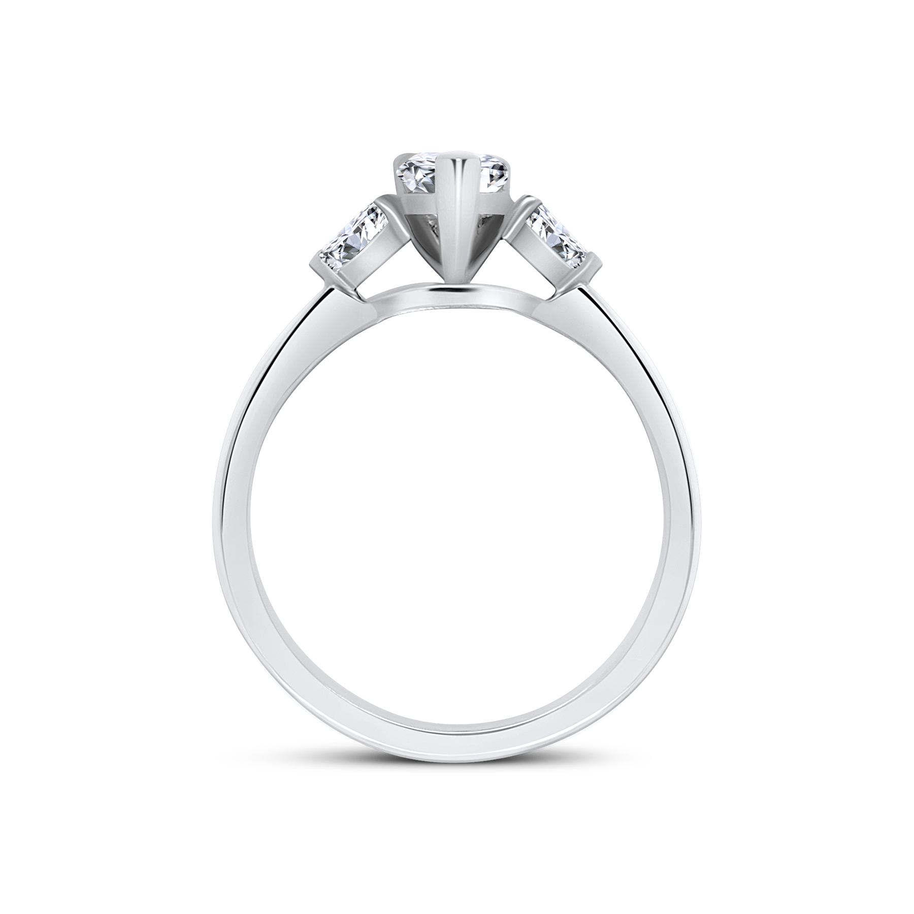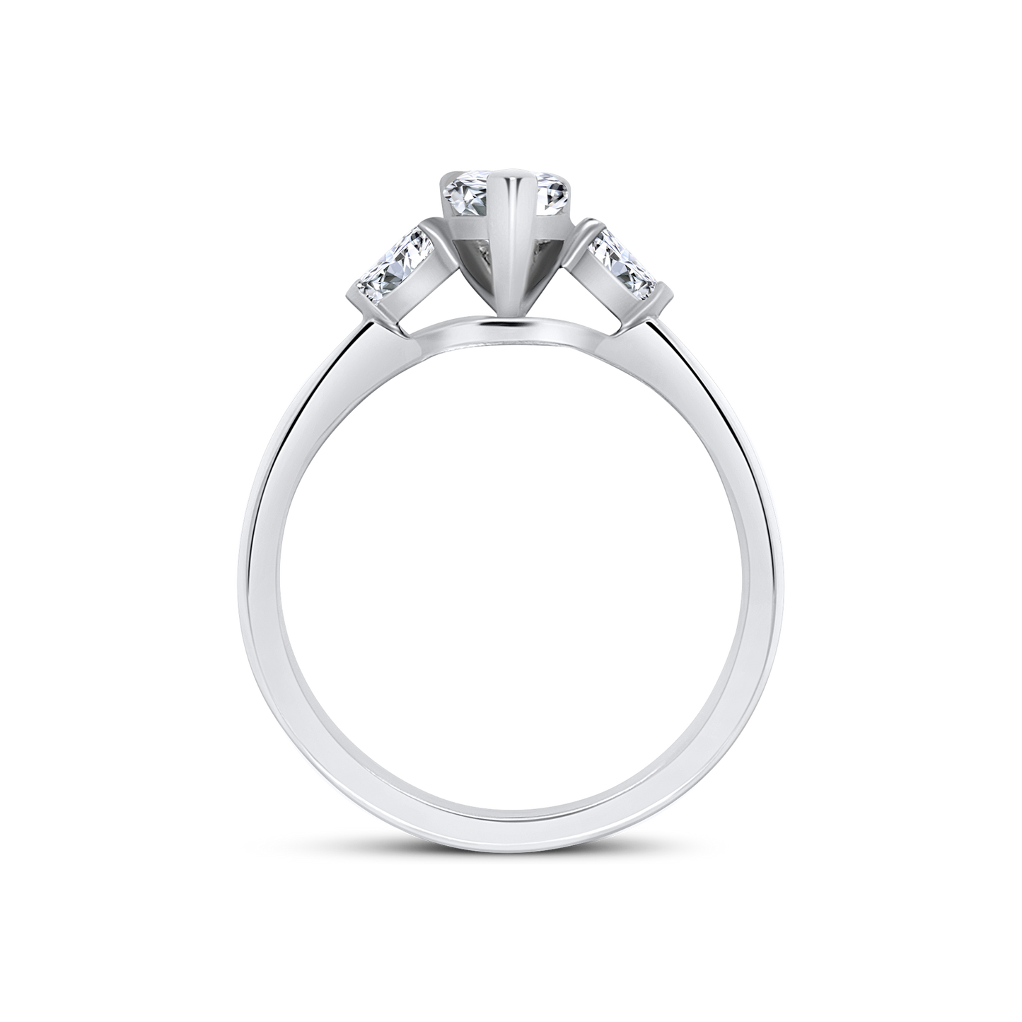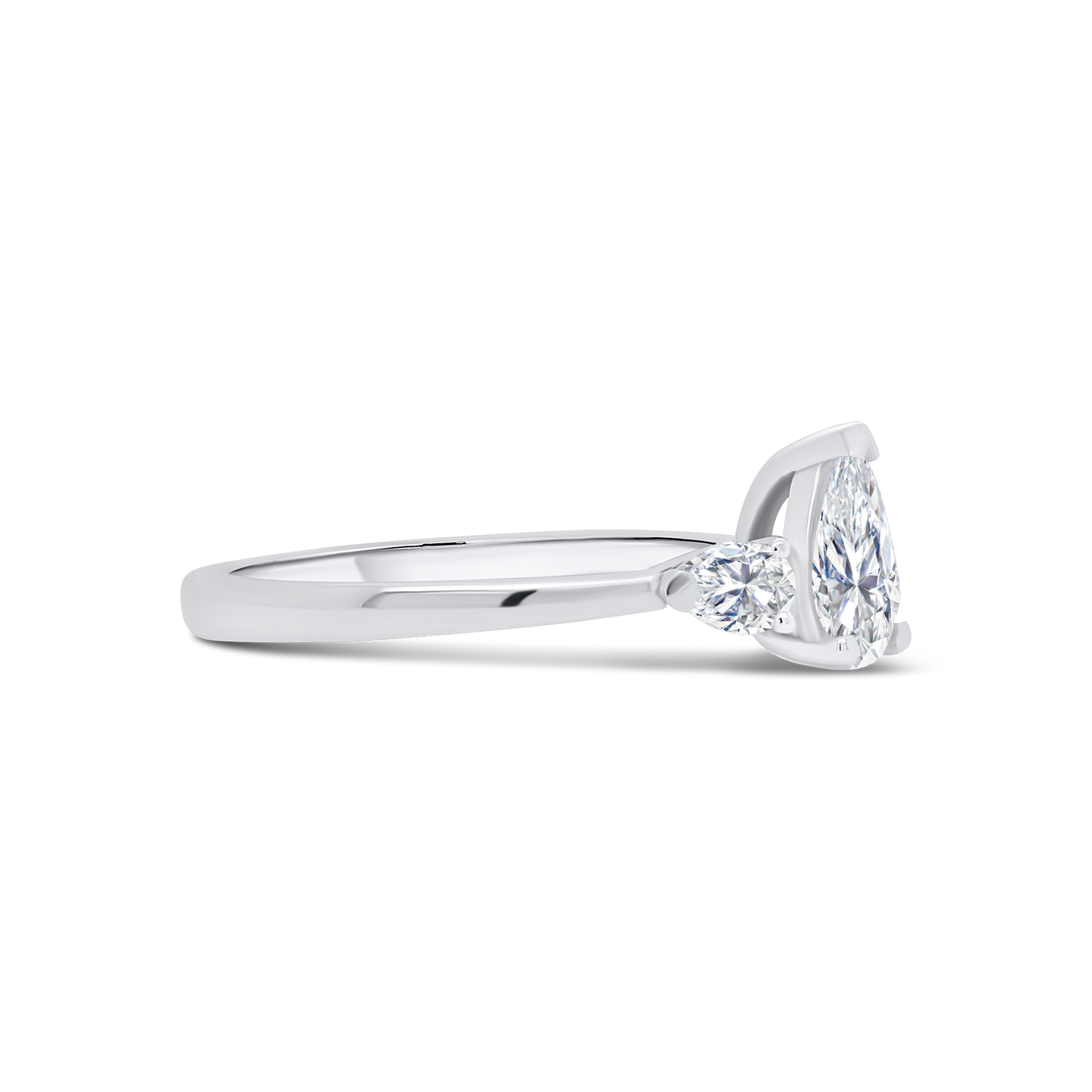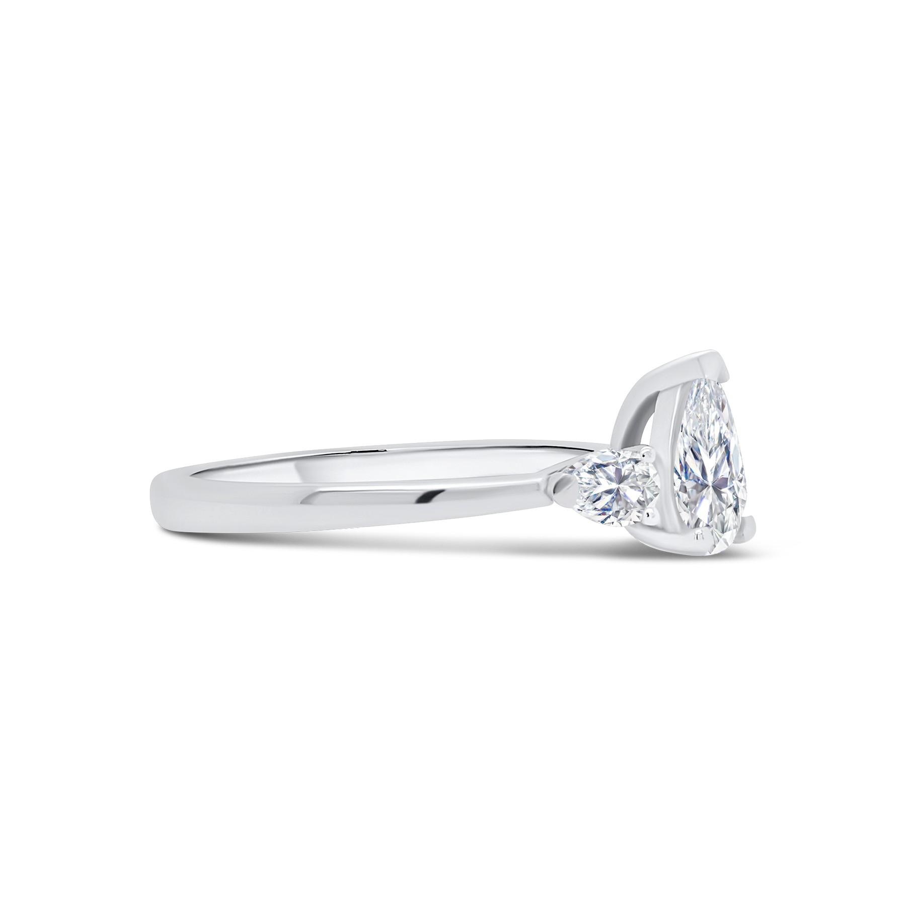 A beautiful three stone diamond ring that is made with a GIA certified 0.59ct pear cut diamond. Accompanying the pear cut is a pair of pear cut diamonds on either end, adding 0.19cts. A elegantly married three stone ring that is presented on a 950 hallmarked platinum band.