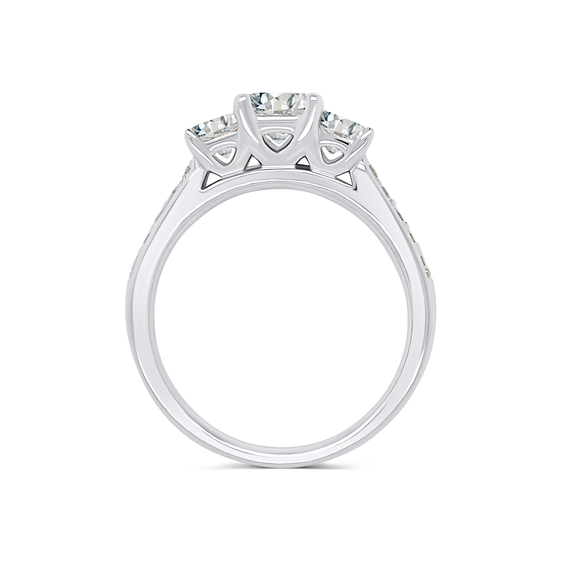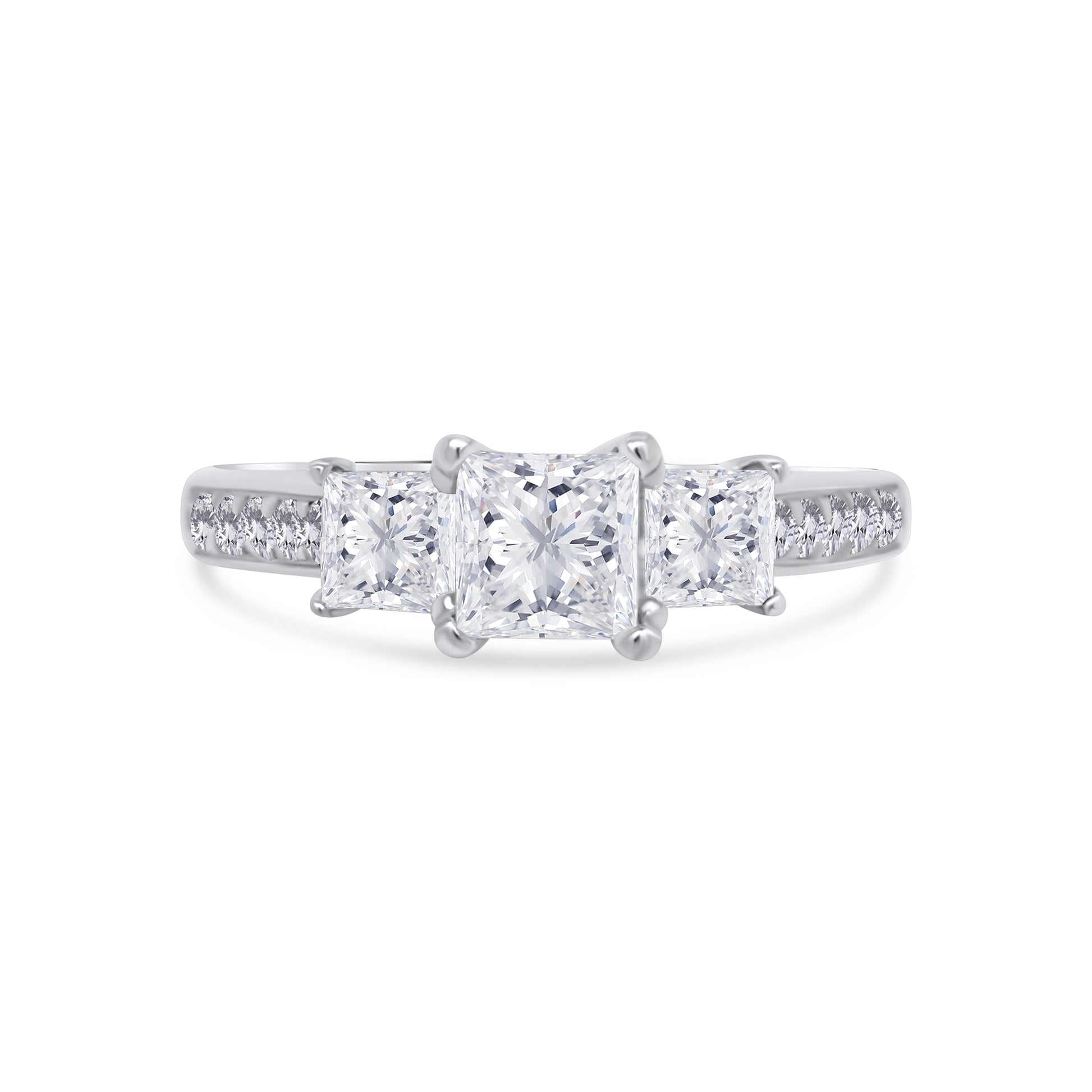 A delicately crafted three stone ring that features a IGI certified 0.55ct princess cut centre diamond. On either end of this diamond is accompanying princess cut diamonds adding a complimenting touch. Presented on a 950 hallmarked platinum band that has shoulder set diamonds that have been encapsulated within a bezel detailing. Shoulder setting and side stones add 0.70ct.