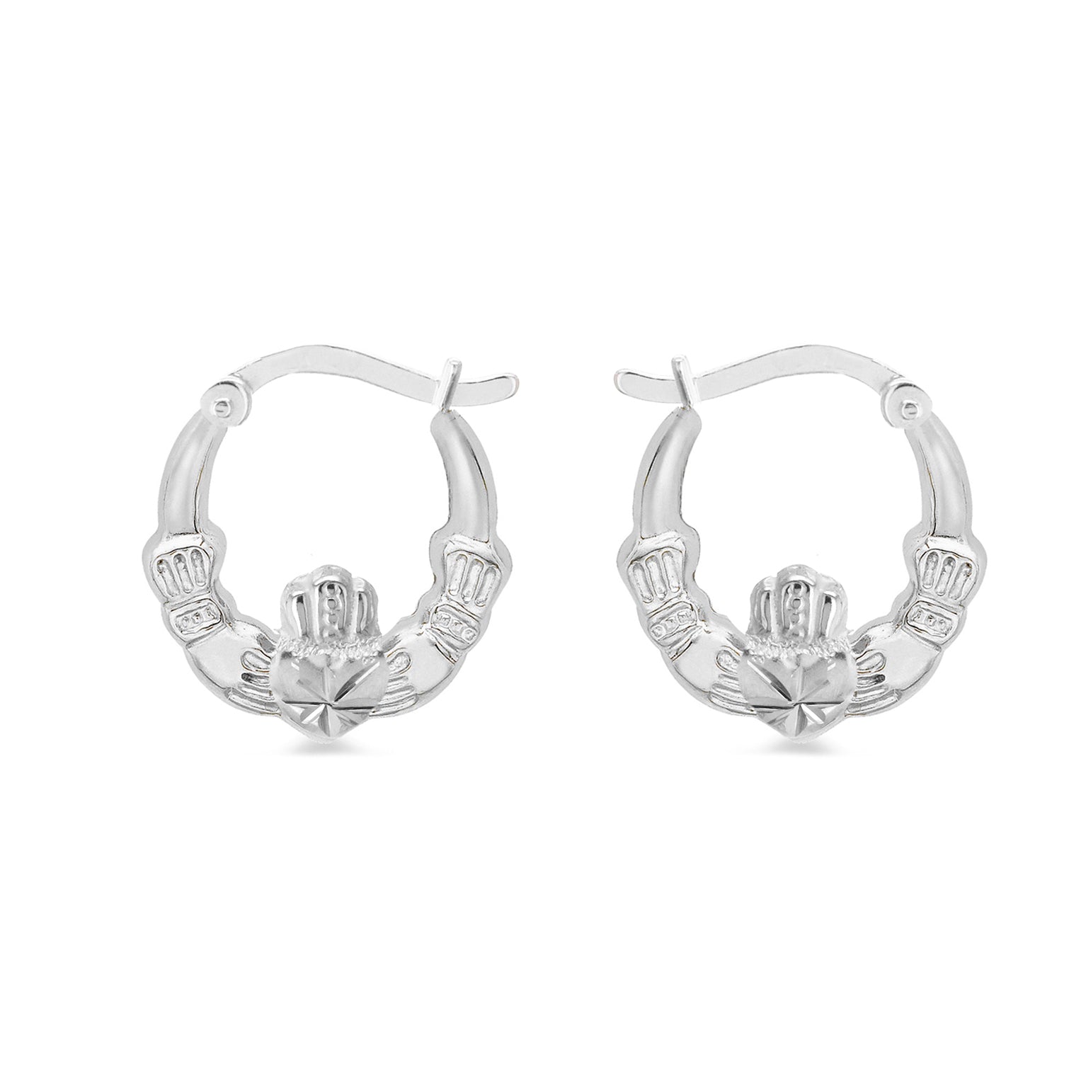 Embrace the enduring charm of Irish heritage with these beautiful silver Claddagh creole earrings, where timeless tradition meets effortless elegance. Expertly handcrafted, these earrings showcase the beloved Claddagh motif of the heart for love, the hands for friendship, and the crown for loyalty, all rendered in gleaming sterling silver with a luxurious polished finish.