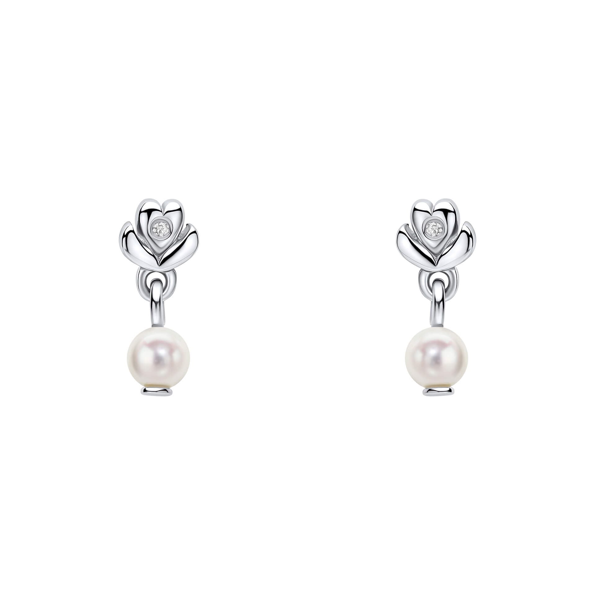 Celebrate life’s precious moments with these stud earrings, beautifully crafted from recycled sterling silver with a radiant platinum plating. Designed with a delicate heart-shaped flower bud, each earring features a twinkling diamond at its centre, while a lustrous freshwater pearl gently sways below, adding a touch of timeless elegance.