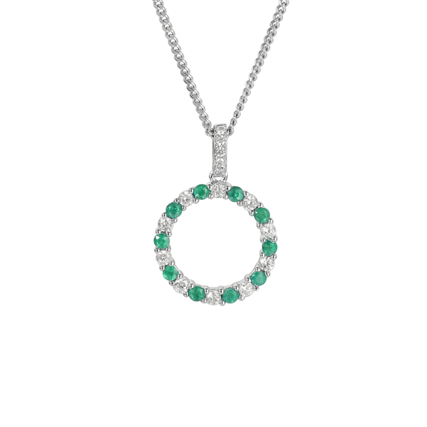 925 Sterling Silver Necklace. Beautifully suited to any occasion, day or night, this ringed pendant has multiple claw set cubic zirconia's alternating with emerald stones, across the face of the circle bridge that connects the curb chain to the pendant.