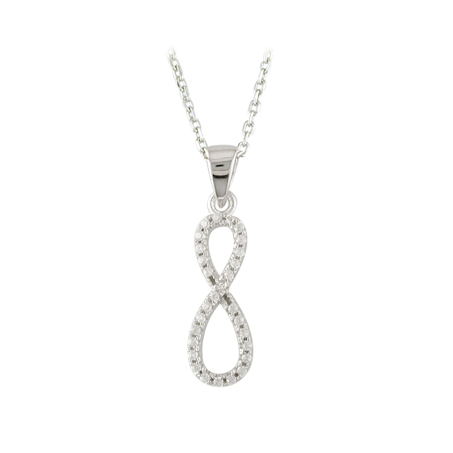 A stunning and elegant necklace featuring cubic zirconia with significant symbolism. The vertical pendant, featuring the infinity symbol, can represent everlasting love, lifelong friendship, or an unbreakable bond. The pendant boasts round cut cubic zirconia stones that move freely and hangs on an 18" trace chain.