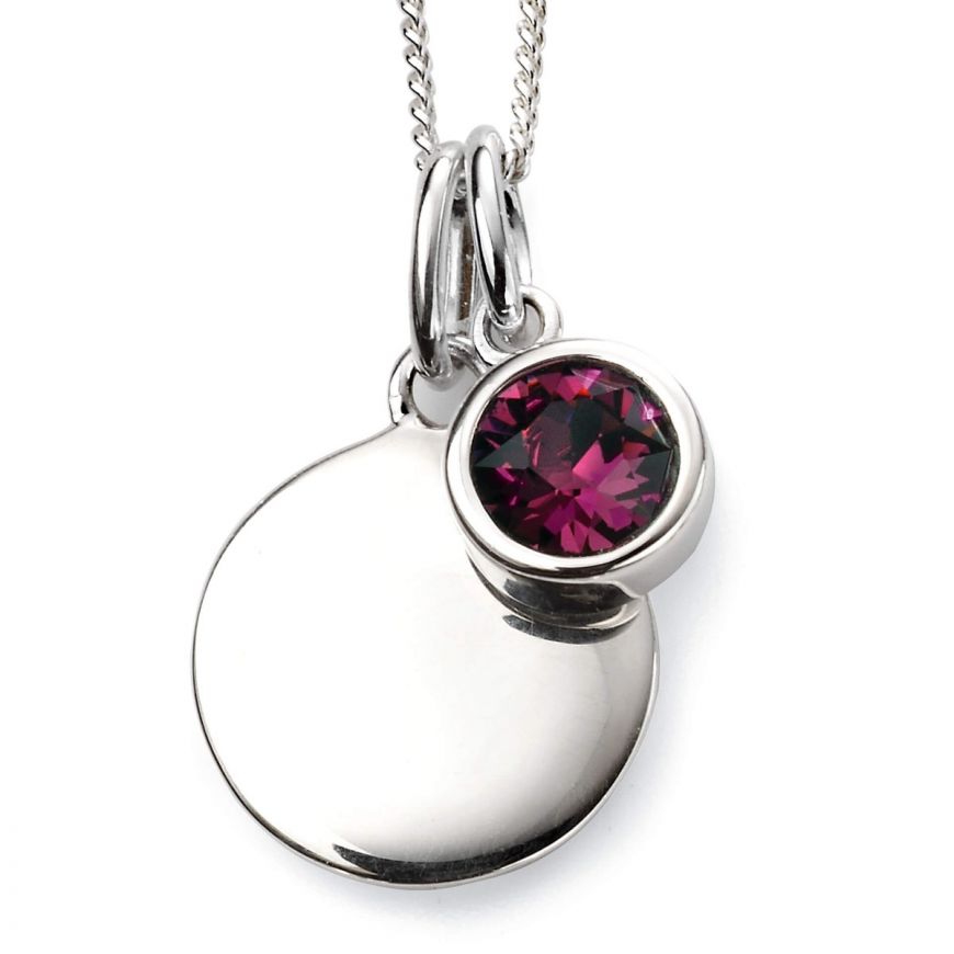 A meaningful February birthstone and personalising disc necklace. Crafted in sterling silver, this necklace features a polished 13mm disc, and a separate rub over pendant that holds a purple hue amethyst styled crystal. Making a special birthday gift to someone born in February, or from you to you. The necklaces disc allows for a personal message to be added, making it truly unique for a loved one.