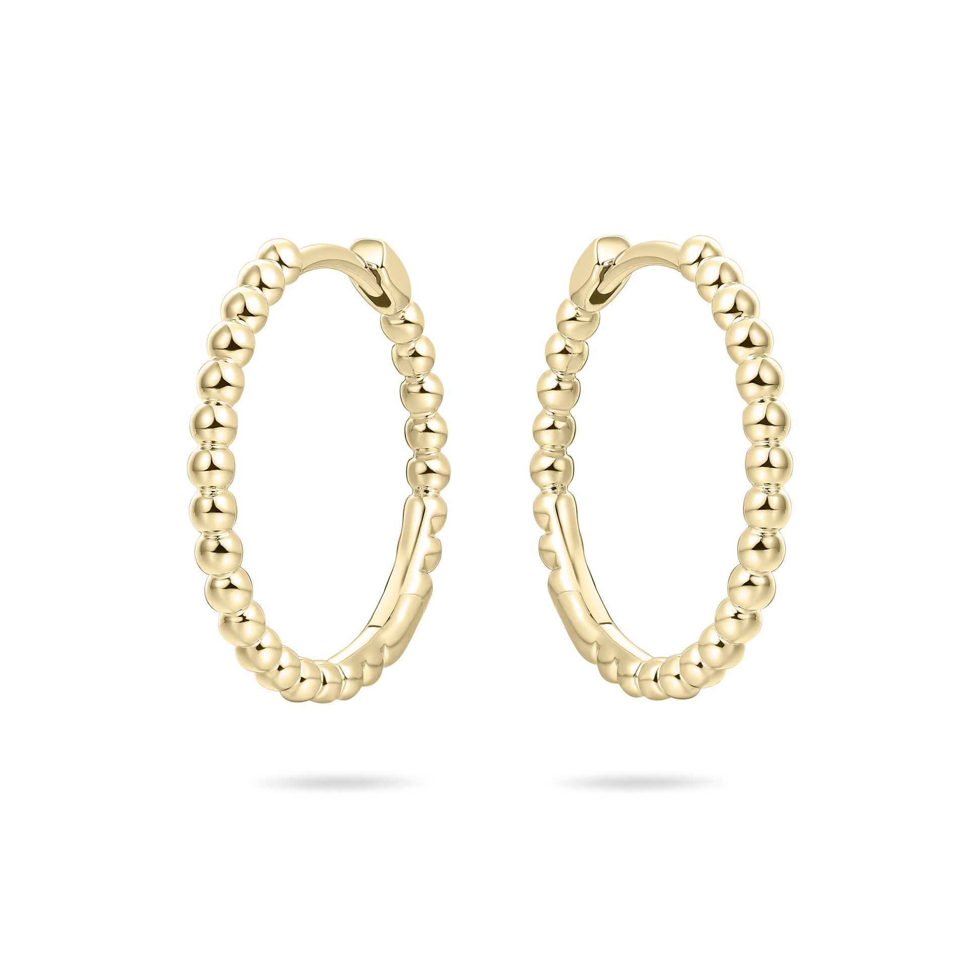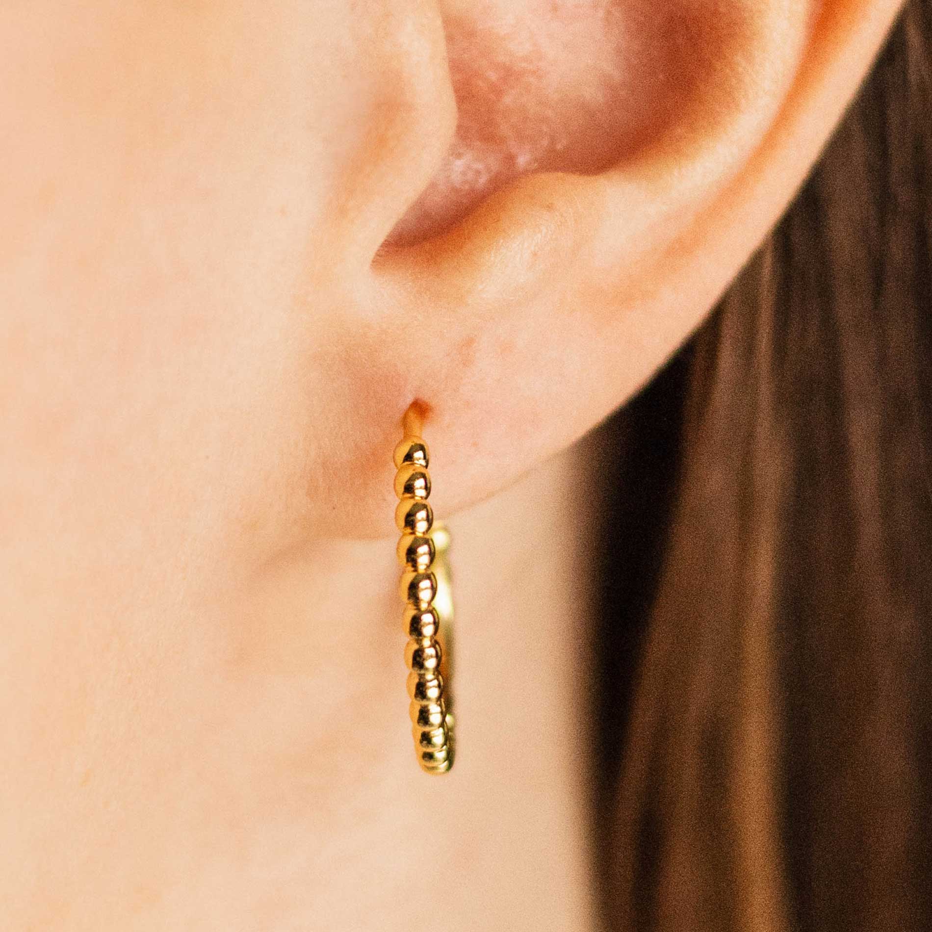 Handcrafted from 925 sterling silver and finished with rich yellow gold plating, each hoop features a sophisticated beaded pattern that adds depth, movement, and subtle sparkle without overwhelming the design.