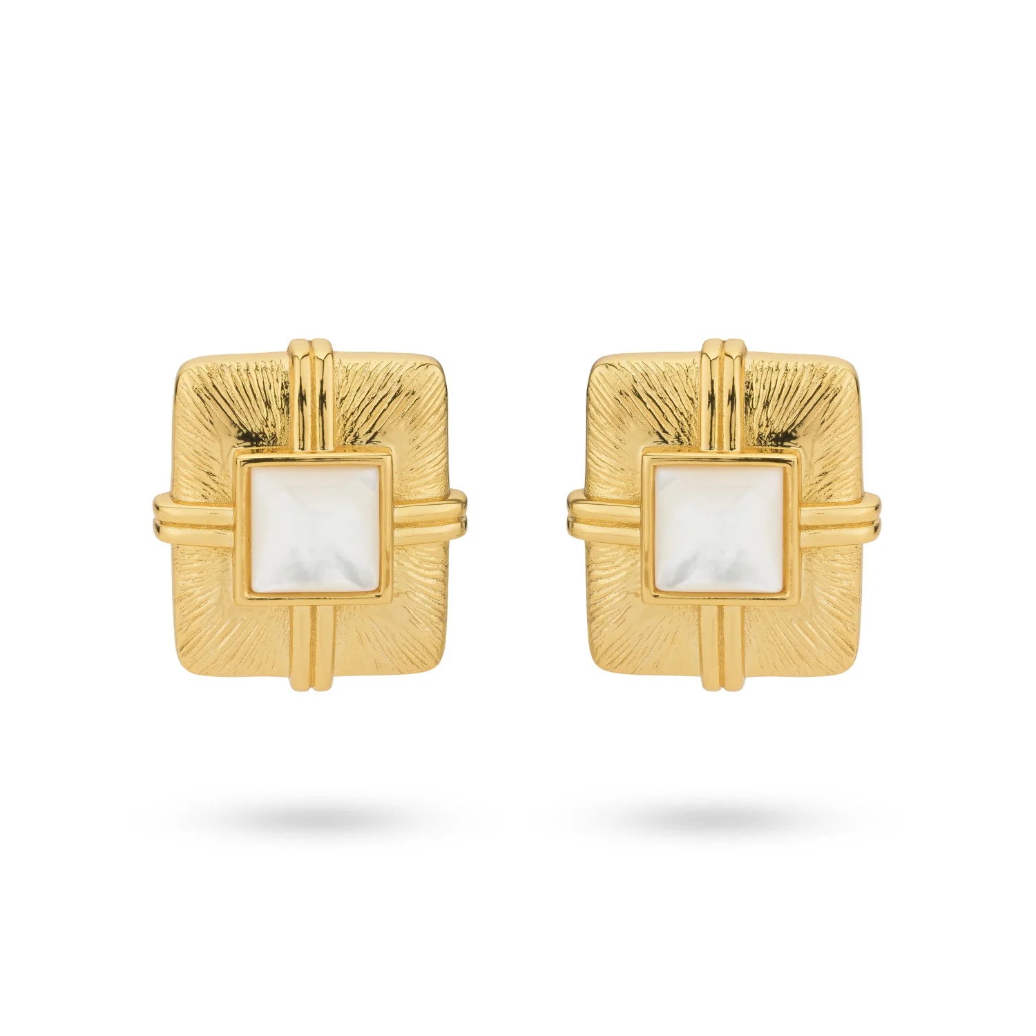 These square stud earrings, crafted from gold plated sterling silver and adorned with a luminous mother-of-pearl stone, exude a distinctive allure with their delicate craftsmanship.