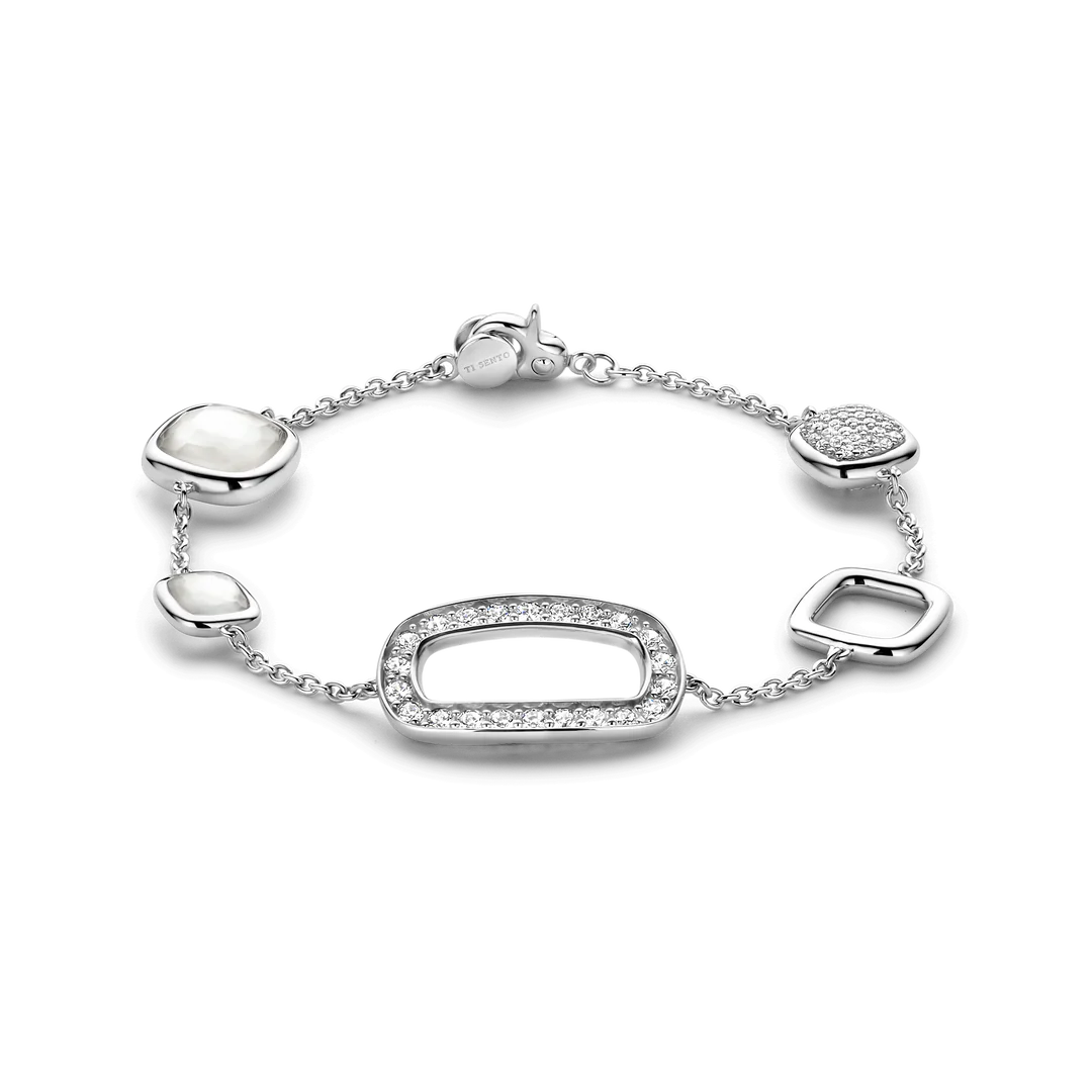 This TI SENTO Silver Charm Bracelet 23065ZI is where modern sophistication meets timeless elegance. Expertly crafted from premium 925 sterling silver and finished with a radiant platinum plating, this refined piece plays with iconic shapes and textures for a look that’s effortlessly chic. A delicate chain links together cushion-shapes and TI SENTO’s signature rectangular motif, creating a harmonious blend of soft curves and sleek geometry. Iridescent mother-of-pearl inlays bring a luminous, natural glow, while pavé-set cubic zirconia details add a dazzling touch, catching the light with every movement. The centrepiece—a bold rectangular link framed in shimmering pavé—anchors the design with contemporary elegance. Perfect for stacking or making a subtle statement on its own.