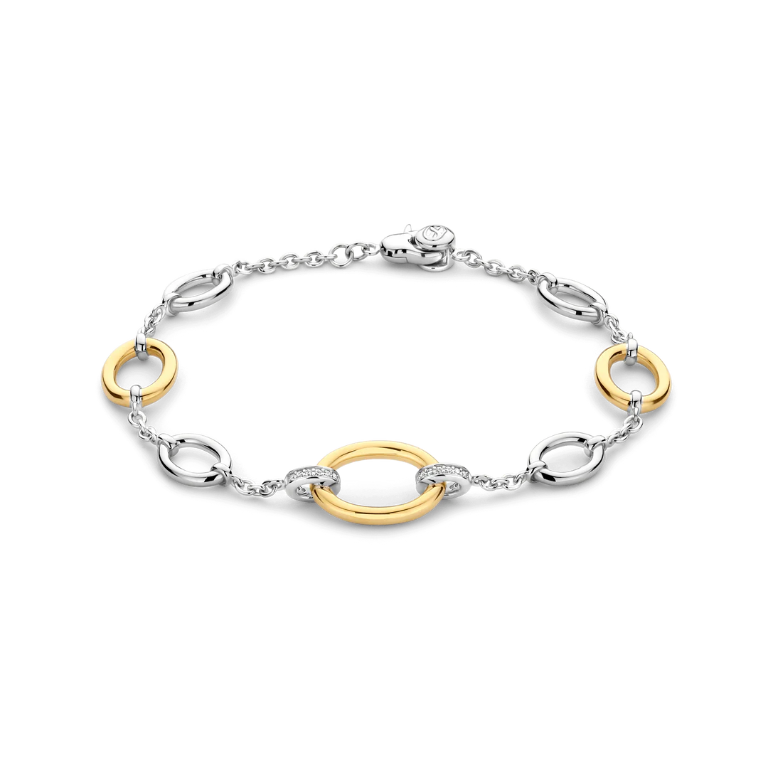 The TI SENTO Bracelet 23073ZY blends contemporary elegance with timeless sophistication. Crafted from 925 sterling silver, it features alternating yellow gold-plated links and polished silver ovals, interconnected by a delicate chain. Two gold-plated links are accented by pavé-set cubic zirconia rings, adding brilliance to the design. Hypoallergenic and nickel-free, this versatile bracelet transitions effortlessly from day to evening wear.