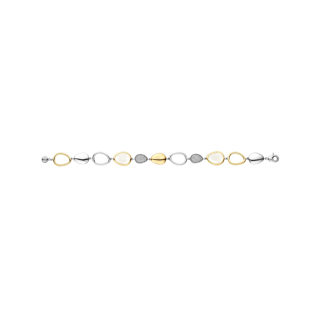 Elevate your wrist with the TI SENTO Gold-Plated Pebble Charm Bracelet 23082MW, a masterful blend of sculptural elegance and radiant sophistication. Meticulously crafted from 925 sterling silver, this bracelet links a series of pebble-shaped charms into a fluid, harmonious line: a milky-white fantasy-cut mother-of-pearl stone cradled in yellow gold plating, a polished gold-plated pebble, pavé discs set with brilliant white cubic zirconia, and openwork and platinum-plated accents that create airy negative space. The rhythmic interplay of light, color, and texture delivers instant gallery worthy impact.