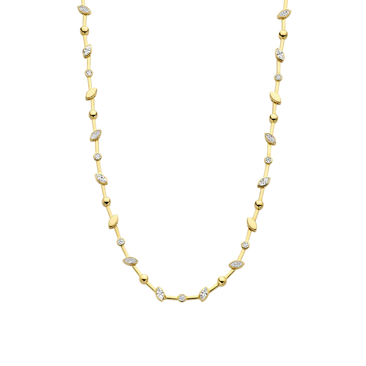 Indulge in vintage-inspired luxury with this TI SENTO gold-plated silver Necklace 34068ZY/42. Crafted from 925 sterling silver and plated in lustrous yellow gold, this necklace features a captivating series of leaf-shaped elements, each adorned with a shimmering pave of white cubic zirconia stones. The radiant gold and the intricate leaf details create a visually stunning effect, reminiscent of the beauty of nature. This necklace is a testament to the art of fine jewellery, offering a harmonious blend of tradition and contemporary design. Elevate your everyday look with this charming statement piece. Wear it alone for a minimalist statement or layered with other TI SENTO necklaces for a personalised touch that exudes effortless chic. Crafted with care for sensitive skin, this nickel-free and hypoallergenic necklace ensures lasting comfort and quality.