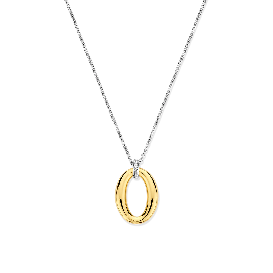 Make a bold yet refined statement with this TI SENTO Gold-Plated Silver Necklace 34091ZY, a stunning creation meticulously crafted from 925 sterling silver and plated with warm yellow gold for a luminous, timeless appeal. At the heart of this exquisite design lies a unique oval-shaped pendant, elegantly adorned with a delicate band of cubic zirconia Pavé that adds a subtle, captivating sparkle. The radiant yellow-gold tones evoke a classic vintage charm while infusing a modern touch, making it a perfect piece to complement the golden hues of summer.