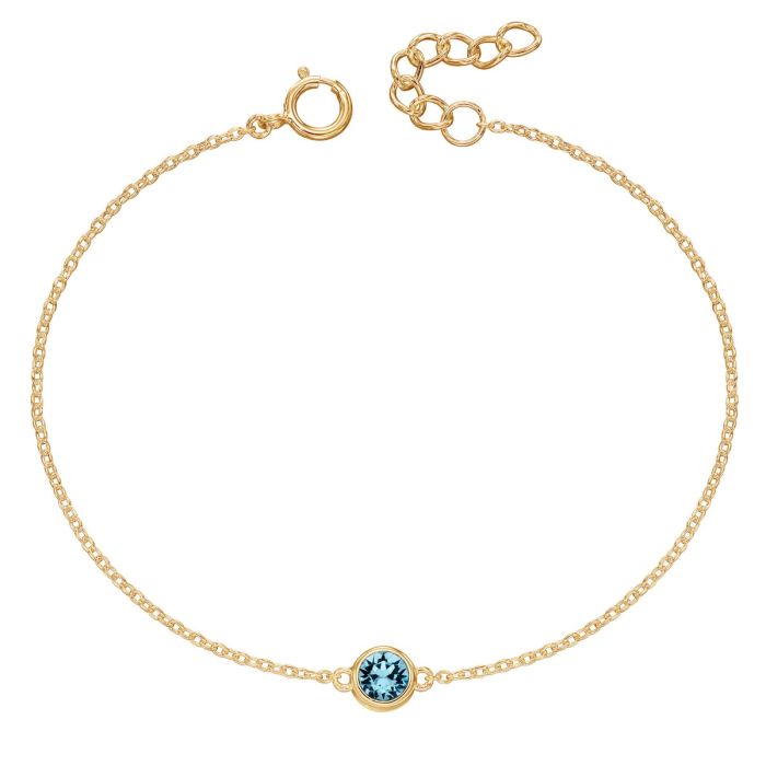 A meaningful March birthstone bracelet. Crafted in yellow gold plated sterling silver, this bracelet features a polished finish and a rub over pendant that holds a Blue Aquamarine styled crystal. Making a special birthday gift to someone born in March, or from you to you. Pair with the matching necklace and earrings for a co-ordinated look!